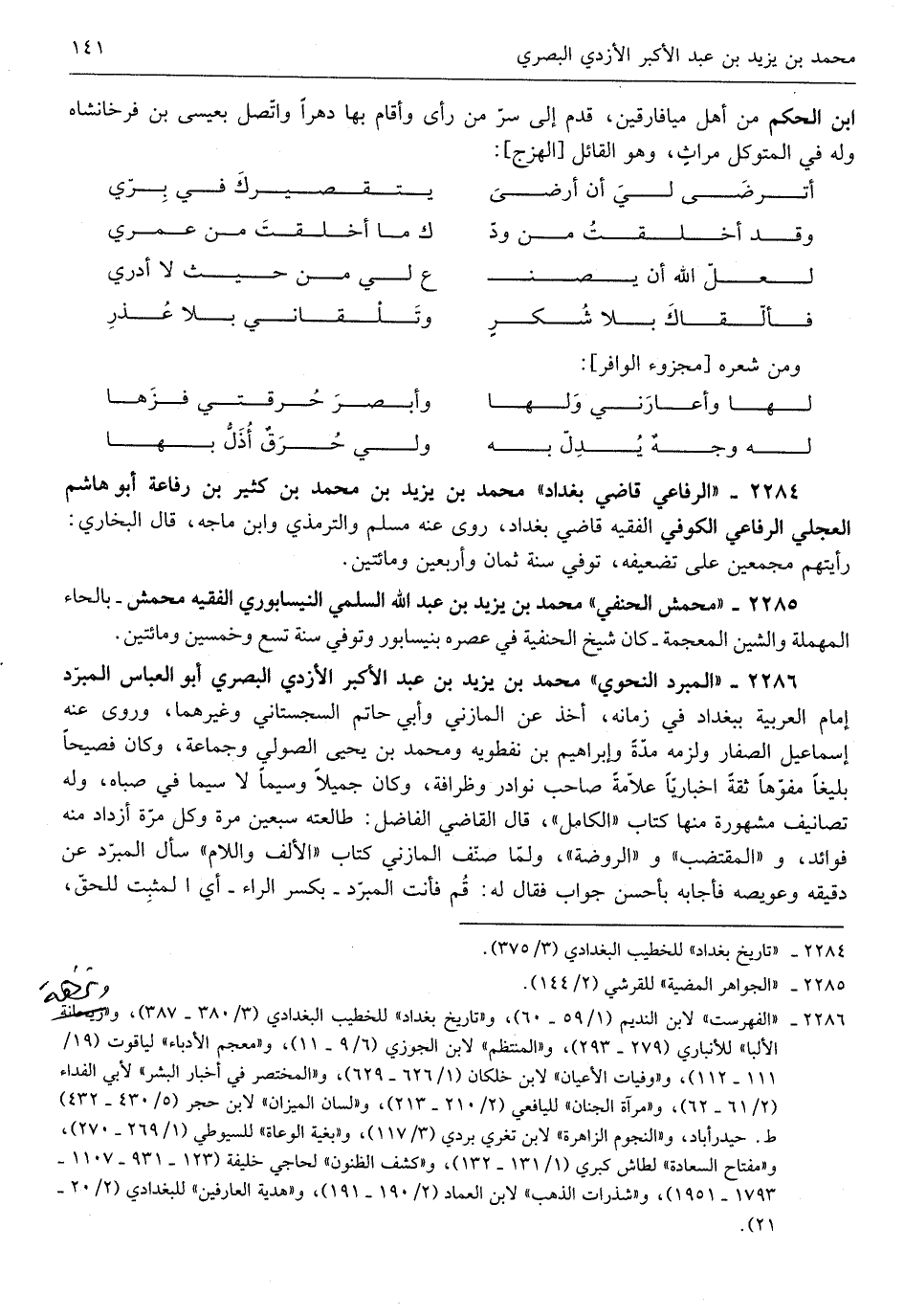 مُحَمَّد بن يزِيد بن عبد الْأَكْبَر الْأَزْدِيّ الْبَصْرِيّ أَبُو الْعَبَّاس الْمبرد إِمَام الْعَرَبيَّة ببغداذ فِي زَمَانه أَخذ عَن الْمَازِني وَأبي حَاتِم السجسْتانِي وَغَيرهمَا وروى عَنهُ إِسْمَاعِيل الصفار وَلَزِمَه مُدَّة وَإِبْرَاهِيم بن نفطويه وَمُحَمّد بن يحيى الصولي وَجَمَاعَة وَكَانَ فصيحاً بليغاً مفوهاً ثِقَة اخبارياً عَلامَة صَاحب نَوَادِر وظرافة وَكَانَ جميلاً وسيماً لَا سِيمَا فِي صباه وَله تصانيف مَشْهُورَة مِنْهَا كتاب الْكَامِل قَالَ القَاضِي الْفَاضِل طالعته سبعين مرّة وكل مرّة أزداد مِنْهُ فَوَائِد والمقتضب وَالرَّوْضَة وَلما صنف الْمَازِني كتاب الْألف وَاللَّام سَأَلَ الْمبرد عَن دقيقه وعويصه فَأَجَابَهُ بِأَحْسَن جَوَاب فَقَالَ لَهُ قُم فَأَنت الْمبرد بِكَسْر الرَّاء أَي الْمُثبت للحق