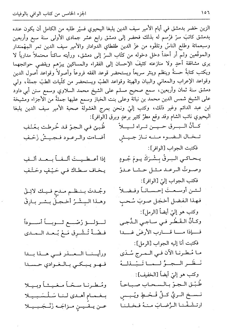 من الْكَامِل أَن يكون عِنْده بِدِمَشْق كَاتب سر فرسم لَهُ بذلك فَحَضَرَ إِلَى دمشق رَابِع عشر جُمَادَى الأولى سنة سبع وَأَرْبَعين وَسبع مائَة وطلع النَّاس وتلقوه من عز الدّين طقطاي الدوادار والأمير سيف الدّين تمر المهمندار والموقعين وَلم أر أحدا دخل دُخُوله من كتاب السِّرّ إِلَى دمشق ورأيته سَاكِنا مُحْتملا مدارياً لَا يرى مشاققة أحد وَلَا منازعته كثير الْإِحْسَان إِلَى الْفُقَرَاء وَالْمَسَاكِين يبرهم وَيَقْضِي حوائجهم وَيكْتب كِتَابَة حَسَنَة وينظم وينثر سَرِيعا ويستحضر قَوَاعِد الْفِقْه فروعاً وأصولاً وقواعد أصُول الدّين وقواعد الْإِعْرَاب والمعاني وَالْبَيَان والهيئة وقواعد الطبل ويستحضر من كليات الطِّبّ جملَة ولي دمشق سنة ثَمَان وَأَرْبَعين سمع صَحِيح مُسلم على الشَّيْخ مُحَمَّد السلاوي وَسمع سنَن أبي دَاوُد على الشَّيْخ شمس الدّين مُحَمَّد بن نباتة وعَلى بنت الخباز وَسمع عَلَيْهَا جملَة من الْأَجْزَاء ومشيخة ابْن عبد الدَّائِم وَغير ذَلِك وَكتب إِلَيّ وَنحن بمرج الغشولة صُحْبَة الْأَمِير سيف الدّين يلبغا اليحيوي نَائِب الشَّام وَقد وَقع مطر كثير برعد وبرق