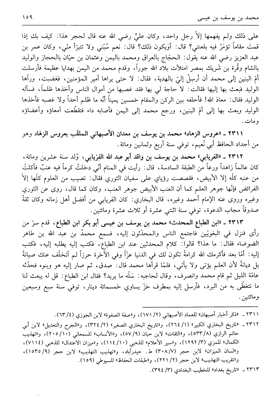 مُحَمَّد بن يُوسُف بن وَاقد أَبُو عبد الله الْفرْيَابِيّ ولد سنة عشْرين وَمِائَة كَانَ عَالما زاهداً ورعاً من الطَّبَقَة السَّادِسَة قَالَ رَأَيْت فِي الْمَنَام أَنِّي دخلت كرماً فِيهِ عِنَب فَأكلت من عنبه كُله إِلَّا الْأَبْيَض فقصصت رُؤْيَايَ على سُفْيَان الثَّوْريّ فَقَالَ تصيب من الْعُلُوم كلهَا إِلَّا الْفَرَائِض فَإِنَّهَا جَوْهَر الْعلم كَمَا أَن الْعِنَب الْأَبْيَض جَوْهَر الْعِنَب وَكَانَ كَمَا قَالَ روى عَن الثَّوْريّ وَغَيره)
