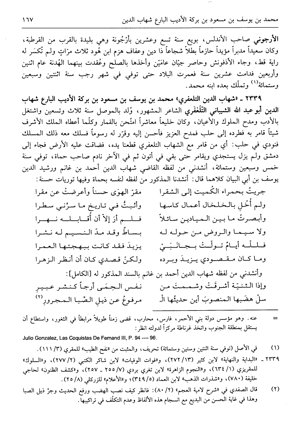 مُحَمَّد بن يُوسُف بن مَسْعُود بن بركَة الأديب البارع شهَاب الدّين أَبُو عبد الله الشَّيْبَانِيّ التلعفري الشَّاعِر الْمَشْهُور ولد بالموصل سنة ثَلَاث وَتِسْعين واشتغل بالأدب ومدح الْمُلُوك والأعيان وَكَانَ خليعاً معاشراً امتحن بالقمار وَكلما أعطَاهُ الْملك الْأَشْرَف شَيْئا قامر بِهِ فطرده إِلَى حلب فمدح الْعَزِيز فَأحْسن إِلَيْهِ وَقرر لَهُ رسوماً فسلك مَعَه ذَلِك المسلك فَنُوديَ فِي حلب أَي من قامر مَعَ الشهَاب التلعفري قَطعنَا يَده فضاقت عَلَيْهِ الأَرْض فجَاء إِلَى دمشق وَلم يزل يستجدي ويقامر حَتَّى بَقِي فِي أتون ثمَّ فِي الآخر نادم صَاحب حماة توفّي سنة خمس وَسبعين وست مائَة أَنْشدني من لَفظه القَاضِي شهَاب الدّين أَحْمد بن غَانِم ورشيد الدّين يُوسُف بن أبي الْبَيَان كِلَاهُمَا قَالَ أنشدنا الْمَذْكُور من لَفظه لنَفسِهِ بحماة وفيهَا توريات حَسَنَة