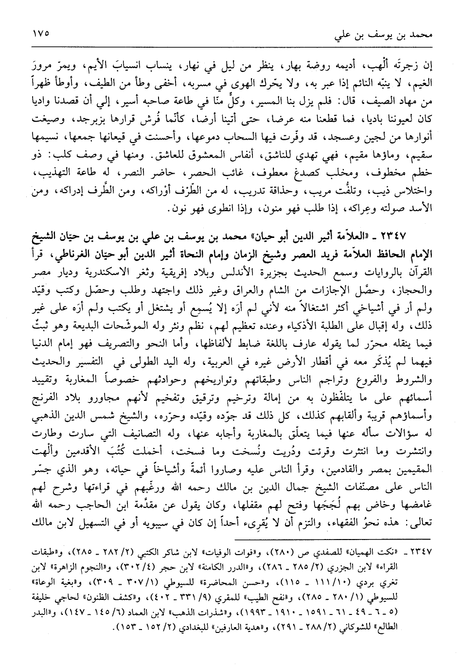 مُحَمَّد بن يُوسُف بن عَليّ بن يُوسُف بن حَيَّان الشَّيْخ الإِمَام الْحَافِظ الْعَلامَة فريد الْعَصْر وَشَيخ الزَّمَان وَإِمَام النُّحَاة أثير الدّين أَبُو حَيَّان الغرناطي قَرَأَ الْقُرْآن بالروايات وَسمع الحَدِيث بِجَزِيرَة الأندلس وبلاد إفريقية وثغر الاسكندرية وديار مصر والحجاز وَحصل الإجازات من الشَّام وَالْعراق وغي ذَلِك واجتهد وَطلب وَحصل وَكتب وَقيد وَلم أر فِي أشياخي أَكثر اشتغالاً مِنْهُ لِأَنِّي لم أره إِلَّا يسمع أَو يشْتَغل أَو يكْتب وَلم يكْتب وَلم أره على غير ذَلِك وَله إقبال على الطّلبَة الأذكياء وَعِنْده تَعْظِيم لَهُم نظم ونثر وَله الموشحات البديعة وَهُوَ ثَبت فِيمَا يَنْقُلهُ مُحَرر لما يَقُوله عَارِف باللغة ضَابِط لألفاظها وَأما النَّحْو والتصريف فَهُوَ إِمَام الدُّنْيَا فيهمَا لم يذكر مَعَه فِي أقطار الأَرْض غَيره فِي الْعَرَبيَّة وَله الْيَد الطُّولى فِي التَّفْسِير والْحَدِيث والشروط وَالْفُرُوع وتراجم النَّاس وطبقاتهم وتواريخهم وحوادثهم خُصُوصا المغاربة وَتَقْيِيد أسمائهم على مَا يتلفظون بِهِ من إمالة وترخيم وترقيق وتفخيم لأَنهم مجاورو بِلَاد الفرنج وأسماؤهم قريبَة وألقابهم كَذَلِك كل ذَلِك قد جوده وَقَيده وحرره وَالشَّيْخ شمس الدّين الذَّهَبِيّ لَهُ سُؤَالَات سَأَلَهُ عَنْهَا فِيمَا يتَعَلَّق بالمغاربة وأجابه عَنْهَا وَله التصانيف الَّتِي سَارَتْ وطارت وانتشرت وَمَا انتثرت وقرئت ودريت وَنسخت وَمَا فسخت أخملت كتب الأقدمين وألهت المقيمين بِمصْر والقادمين وَقَرَأَ النَّاس عَلَيْهِ وصاروا أَئِمَّة وأشياخاً فِي حَيَاته وَهُوَ الَّذِي جسر النَّاس على مصنفات الشَّيْخ جمال الدّين ابْن مَالك رَحمَه الله ورغبهم فِي قرَاءَتهَا وَشرح لَهُم غامضها وخاض بهم لججها وَفتح لَهُم مقفلها وَكَانَ يَقُول عَن مُقَدّمَة ابْن الْحَاجِب رَحمَه الله تَعَالَى هَذِه نَحْو الْفُقَهَاء وَالْتزم أَن لَا يقرئ أحدا إِلَّا إِن كَانَ فِي سِيبَوَيْهٍ أَو فِي التسهيل لِابْنِ مَالك