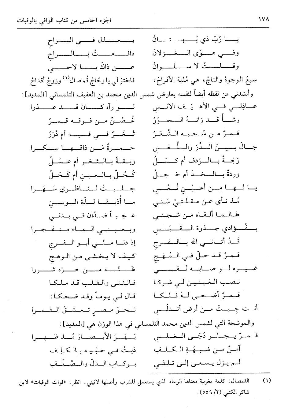 وأنشدني من لَفظه أَيْضا لنَفسِهِ يُعَارض شمس الدّين مُحَمَّد بن الْعَفِيف التلمساني