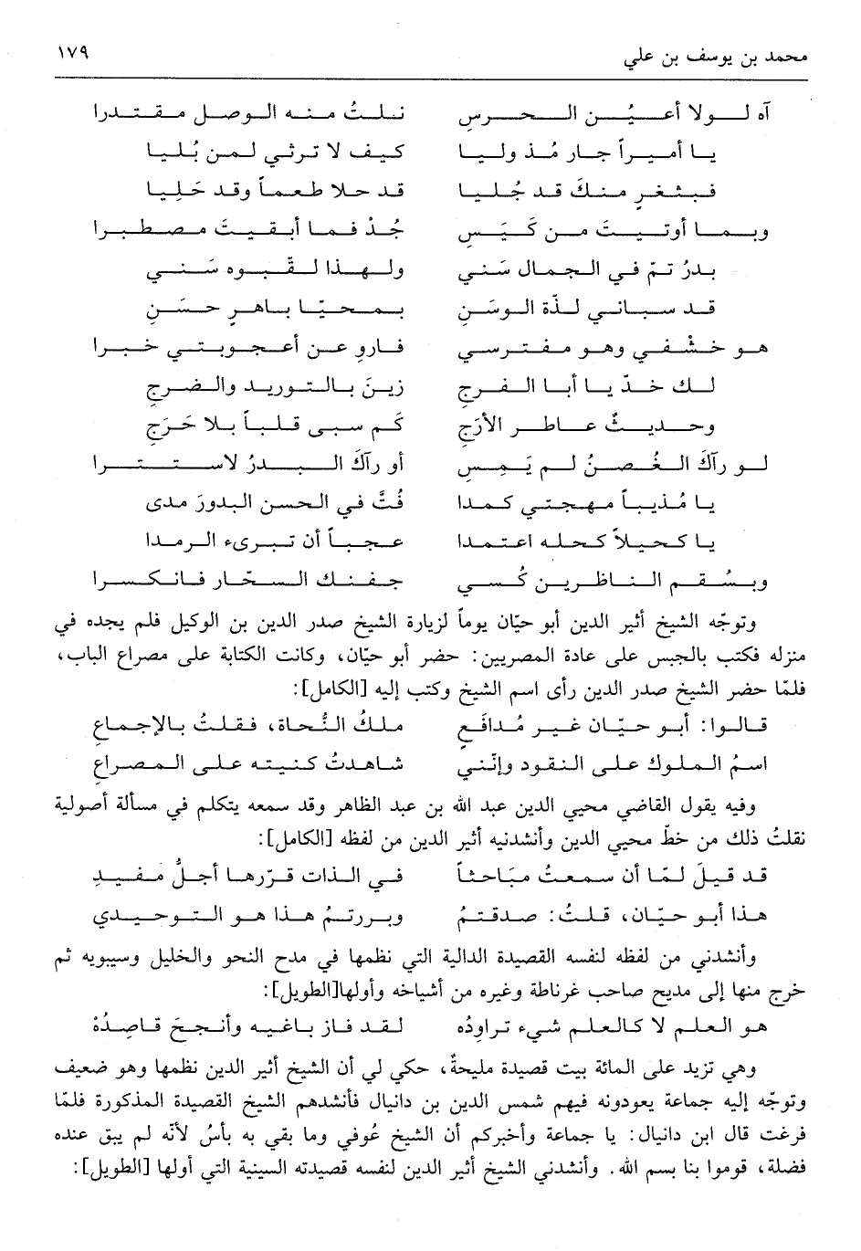 وَهِي تزيد على الْمِائَة بَيت قصيدة مليحة حُكيَ لي أَن الشَّيْخ أثير الدّين نظمها وَهُوَ ضَعِيف وَتوجه إِلَيْهِ جمَاعَة يعودونه فيهم شمس الدّين ابْن دانيال فأنشدهم الشَّيْخ القصيدة الْمَذْكُورَة فَلَمَّا فرغت قَالَ ابْن دانيال يَا جمَاعَة وأخبركم أَن الشَّيْخ عوفي وَمَا بَقِي بِهِ بَأْس لِأَنَّهُ لم يبْق عِنْده فَضله قومُوا بِنَا بِسم الله وأنشدني الشَّيْخ أثير الدّين لنَفسِهِ قصيدته السينية الَّتِي أَولهَا