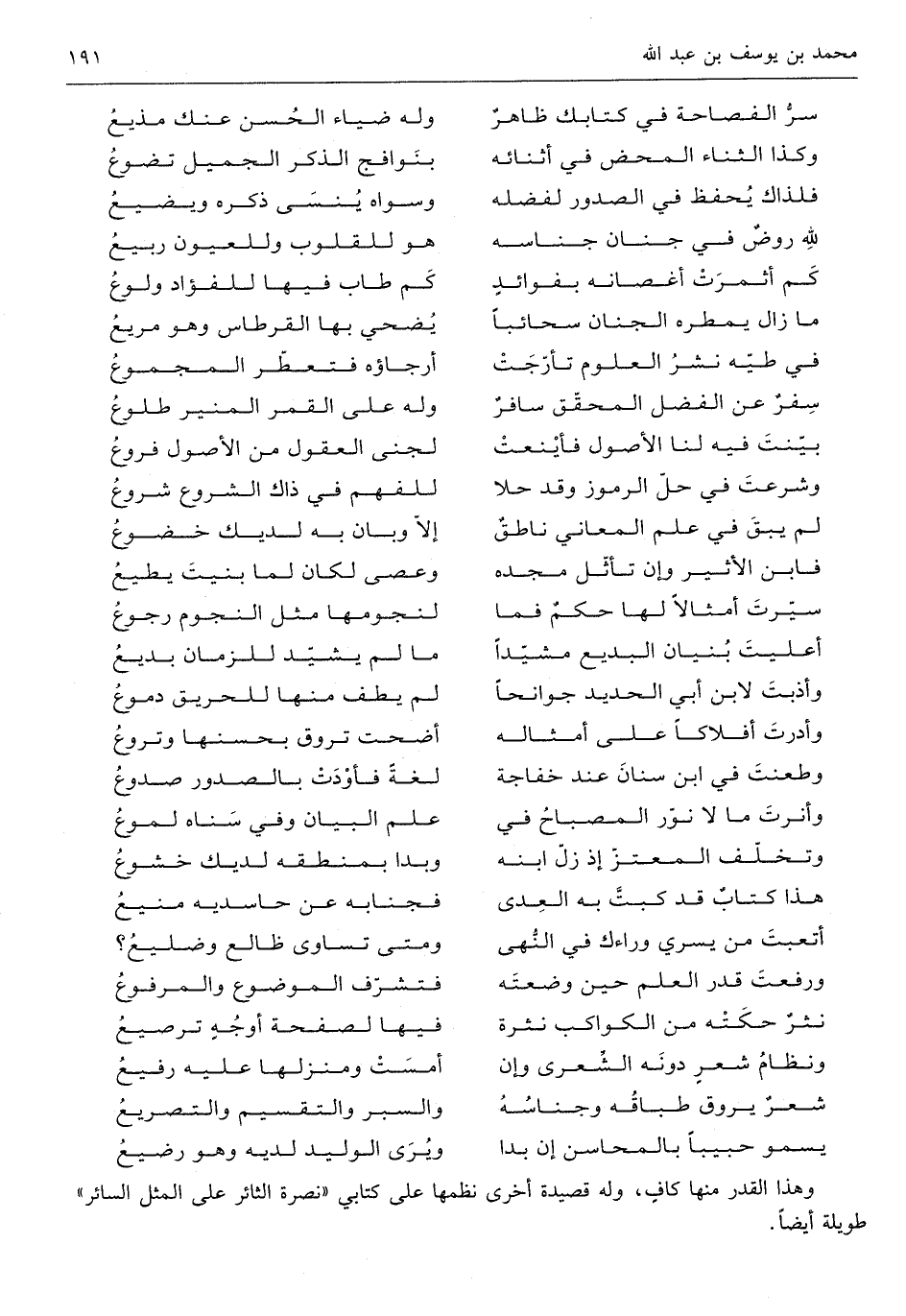 وَهَذَا الْقدر مِنْهَا كَاف وَله قصيدة أُخْرَى نظمها على كتابي نصْرَة الثائر على الْمثل السائر طَوِيلَة أَيْضا