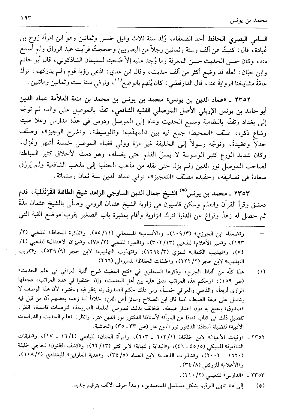 مُحَمَّد بن يُونُس بن مُحَمَّد بن مَنْعَة الْعَلامَة عماد الدّين أَبُو حَامِد ابْن يُونُس الإربلي الأَصْل الْموصِلِي الْفَقِيه الشَّافِعِي تفقه بالموصل على وَالِده ثمَّ توجه إِلَى بَغْدَاد وتفقه بالنظامية وَسمع الحَدِيث وَعَاد إِلَى الْموصل ودرس عدَّة مدارس وَعلا صيته وشاع ذكره صنف الْمُحِيط جمع فِيهِ بَين الْمُهَذّب والوسيط وَشرح الْوَجِيز وصنف جدلاً وعقيدة وَتوجه رَسُولا إِلَى الْخَلِيفَة غير مرّة وَولي قَضَاء الْموصل خَمْسَة أشهر وعزل وَكَانَ شَدِيد الْوَرع كثير الوسوسة لَا يمس الْقَلَم حَتَّى يغسلهُ وَهُوَ دمث الْأَخْلَاق كثير المباطنة لصَاحب الْموصل نور الدّين وَلم يزل حَتَّى نَقله من مَذْهَب الْحَنَفِيَّة إِلَى مَذْهَب الشَّافِعِيَّة وَلم يرْزق سَعَادَة فِي تصانيفه وحفيده مُصَنف التَّعْجِيز توفّي عماد الدّين سنة ثَمَان وست مائَة