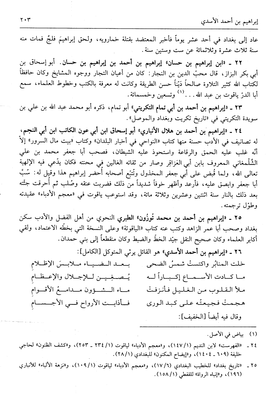 إِبْرَاهِيم بن أَحْمد بن هِلَال الْأَنْبَارِي أَبُو إِسْحَاق ابْن أبي عون الْكَاتِب ابْن أبي النَّجْم لَهُ تصانيف فِي الْأَدَب حَسَنَة مِنْهَا كتاب النواحي فِي أَخْبَار الْبلدَانِ وَكتاب بَيت مَال السرُور إِلَّا أَنه غلب عَلَيْهِ الْحمق والرقاعة واستحوذ عَلَيْهِ الشَّيْطَان فصحب أَبَا جَعْفَر مُحَمَّد بن عَليّ الشلمغاني الْمَعْرُوف بِابْن أبي العزاقر وَصَارَ من ثقاته الغالين فِي محنته فَكَانَ يَدعِي فِيهِ الإلهية تَعَالَى الله وَلما قبض على أبي جَعْفَر المخذول وتتبع أَصْحَابه أحضر إِبْرَاهِيم هَذَا وَقيل لَهُ سبّ أَبَا جَعْفَر وابصق عَلَيْهِ فأرعد وَأظْهر خوفًا شَدِيدا من ذَلِك فَضربت عُنُقه وصلب ثمَّ أحرقت جثته بعد ذَلِك بالنَّار سنة اثْنَتَيْنِ وَعشْرين وَثَلَاث مائَة وَقد استوعب ياقوت فِي مُعْجم الأدباء عقيدته وَطول تَرْجَمته