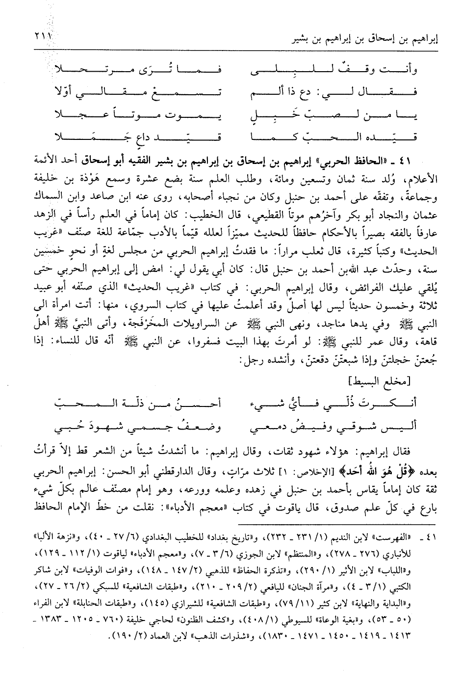 إِبْرَاهِيم بن إِسْحَاق بن إِبْرَاهِيم بن بشير الْفَقِيه أَبُو إِسْحَاق أحد الْأَئِمَّة الْأَعْلَام ولد سنة ثَمَان وَتِسْعين وَمِائَة وَطلب الْعلم سنة بضع عشرَة وَسمع هَوْذَة بن خَليفَة وَجَمَاعَة وتفقه على أَحْمد بن حَنْبَل وَكَانَ من نجباء أَصْحَابه روى عَنهُ ابْن صاعد وَابْن السماك عُثْمَان والنجاد أَبُو بكر وَآخرهمْ موتا الْقطيعِي قَالَ الْخَطِيب كَانَ إِمَامًا فِي الْعلم رَأْسا فِي الزّهْد عَارِفًا بالفقه بَصيرًا بِالْأَحْكَامِ حَافِظًا للْحَدِيث مُمَيّزا لعلله قيمًا بالأدب جمَاعَة للغة صنف غَرِيب الحَدِيث وكتباً كَثِيرَة قَالَ ثَعْلَب مرَارًا مَا فقدت إِبْرَاهِيم الْحَرْبِيّ من مجْلِس لُغَة أَو نَحْو خمسين سنة وَحدث عبد الله ابْن أَحْمد بن حَنْبَل قَالَ كَانَ أبي يَقُول لي امْضِ إِلَى إِبْرَاهِيم الْحَرْبِيّ حَتَّى يلقِي عَلَيْك الْفَرَائِض وَقَالَ إِبْرَاهِيم الْحَرْبِيّ فِي كتاب غَرِيب الحَدِيث الَّذِي صنفه أَبُو عبيد ثَلَاثَة وَخَمْسُونَ حَدِيثا لَيْسَ لَهَا أصل وَقد أعلمت عَلَيْهَا فِي كتاب السروي مِنْهَا أَتَت امْرَأَة إِلَى النَّبِي صلى الله عَلَيْهِ وَسلم وَفِي يَدهَا مناجد وَنهى النَّبِي صلى الله عَلَيْهِ وَسلم عَن السراويلات المخرفجة وأتى النَّبِي صلى الله عَلَيْهِ وَسلم أهل قاهة وَقَالَ عمر للنَّبِي صلى الله عَلَيْهِ وَسلم لَو أمرت بِهَذَا الْبَيْت فسفروا عَن النَّبِي صلى الله عَلَيْهِ وَسلم أَنه قَالَ للنِّسَاء إِذا جعتن خجلتن وَإِذا شبعتن دقعتن وأنشده رجل