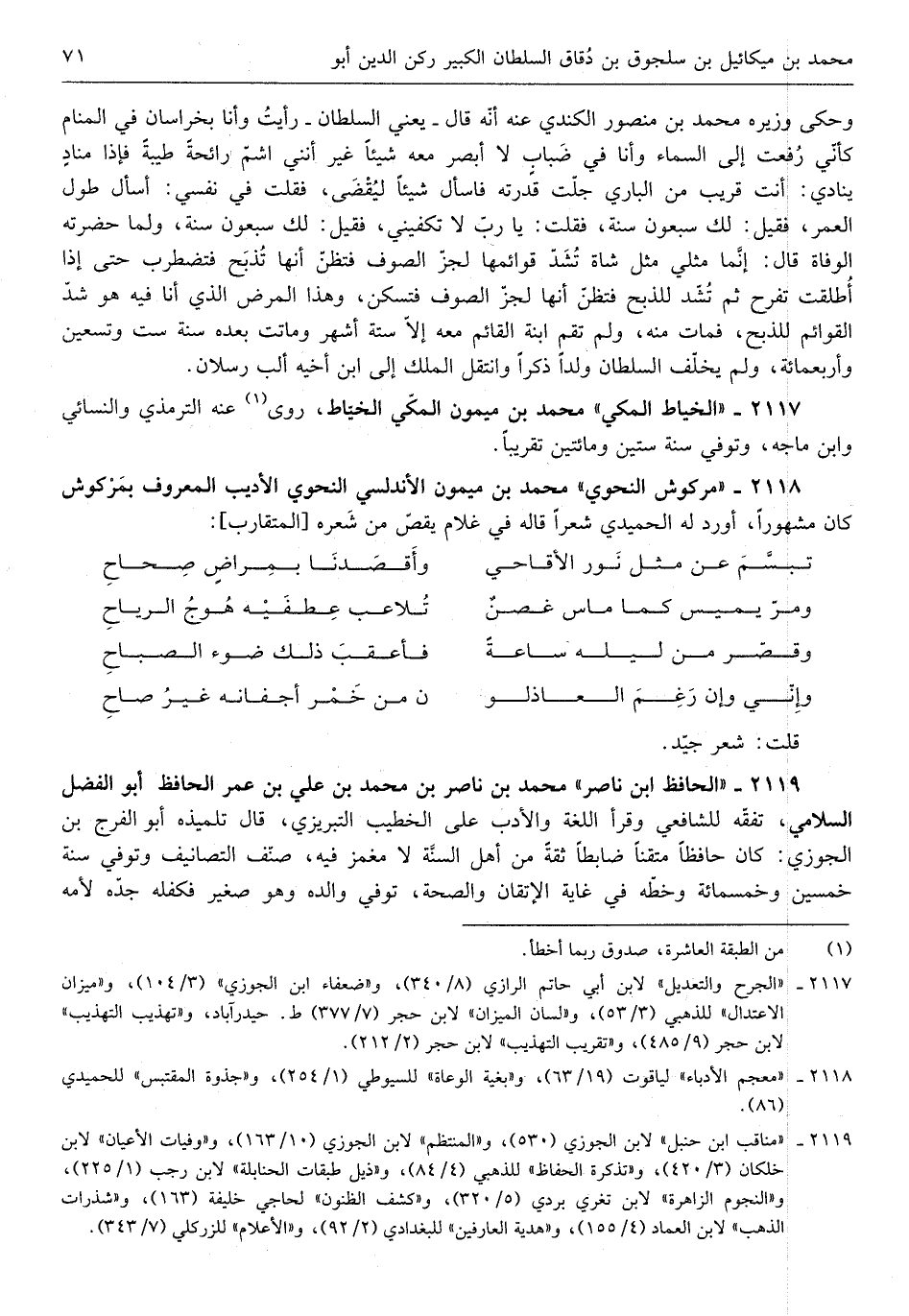 مُحَمَّد بن نَاصِر بن مُحَمَّد بن عَليّ بن عمر الْحَافِظ أَبُو الْفضل السلَامِي تفقه للشَّافِعِيّ وَقَرَأَ اللُّغَة وَالْأَدب على الْخَطِيب التبريزي قَالَ تِلْمِيذه أَبُو الْفرج ابْن الْجَوْزِيّ كَانَ حَافِظًا متقناً ضابطاً ثِقَة من أهل السّنة لَا مغمز فِيهِ صنف التصانيف وَتُوفِّي سنة خمسين وَخمْس مائَة وخطه فِي غَايَة الإتقان وَالصِّحَّة توفّي وَالِده وَهُوَ صَغِير فكلفه جده لأمه