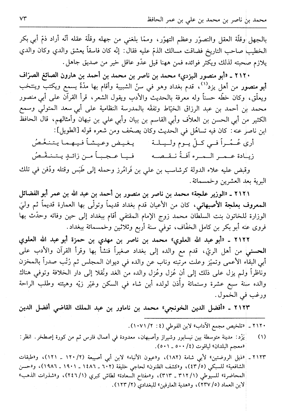 مُحَمَّد بن نَاصِر بن مُحَمَّد بن أَحْمد بن هَارُون الصَّائِغ الصراف أَبُو مَنْصُور من أهل يزدْ قدم بغداذ وَهُوَ فِي سنّ الشبيبة وَأقَام بهَا مُدَّة يسمع وَيكْتب وينتخب ويعلق وَكَانَ خطه حسنا وَله معرفَة بِالْحَدِيثِ وَالْأَدب وَيَقُول الشّعْر قَرَأَ الْقُرْآن على أبي مَنْصُور مُحَمَّد بن أَحْمد بن عبد الرَّزَّاق الْخياط وتفقه بِالْمَدْرَسَةِ النظامية على أبي سعد الْمُتَوَلِي وَسمع الْكثير من أبي الْحسن بن العلاف وَأبي الْقَاسِم بن بَيَان وَأبي عَليّ بن نَبهَان وأمثالهم قَالَ الْحَافِظ ابْن نَاصِر عَنهُ كَانَ فِيهِ تساهل فِي الحَدِيث وَكَانَ يصحف وَمن شعره قَوْله