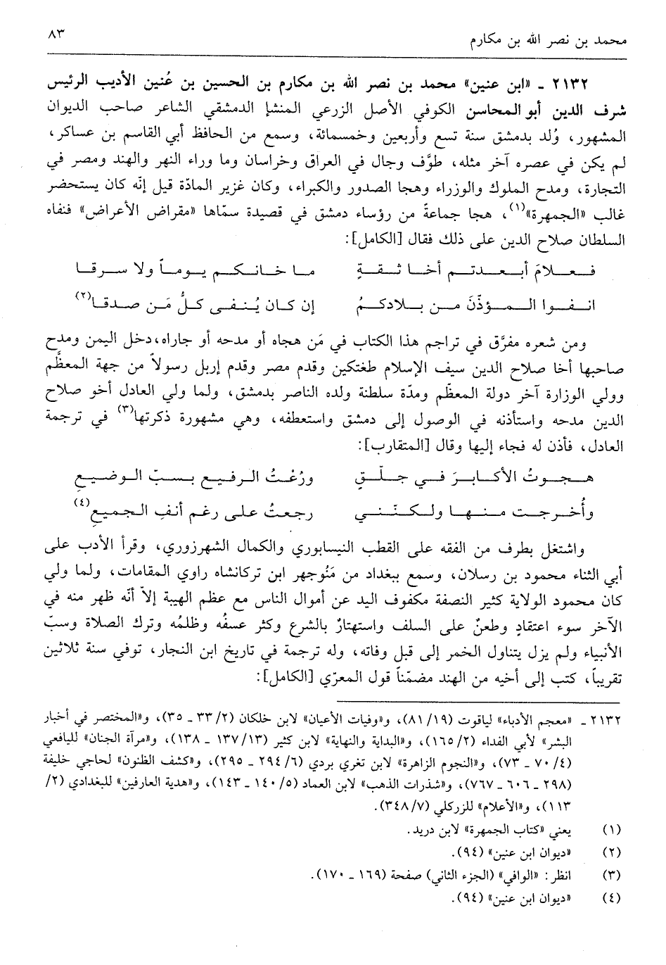 مُحَمَّد بن نصر الله بن مَكَارِم بن الْحُسَيْن بن عنين الأديب الرئيس شرف الدّين أَبُو المحاسن الْكُوفِي الأَصْل الزرعي المنشإ الدِّمَشْقِي الشَّاعِر صَاحب الدِّيوَان الْمَشْهُور ولد بِدِمَشْق سنة تسع وَأَرْبَعين وَخمْس مائَة وَسمع من الْحَافِظ أبي الْقَاسِم بن عَسَاكِر لم يكن فِي عصره آخر مثله طوف وجال فِي الْعرَاق وخراسان وَمَا وَرَاء النَّهر والهند ومصر فِي التِّجَارَة ومدح الْمُلُوك والوزراء وهجا الصُّدُور والكبراء وَكَانَ غزير الْمَادَّة قيل إِنَّه كَانَ يستحضر غَالب الجمهرة هجا جمَاعَة من رُؤَسَاء دمشق فِي قصيدة سَمَّاهَا مقراض الْأَعْرَاض فنفاه السُّلْطَان صَلَاح الدّين على ذَلِك فَقَالَ