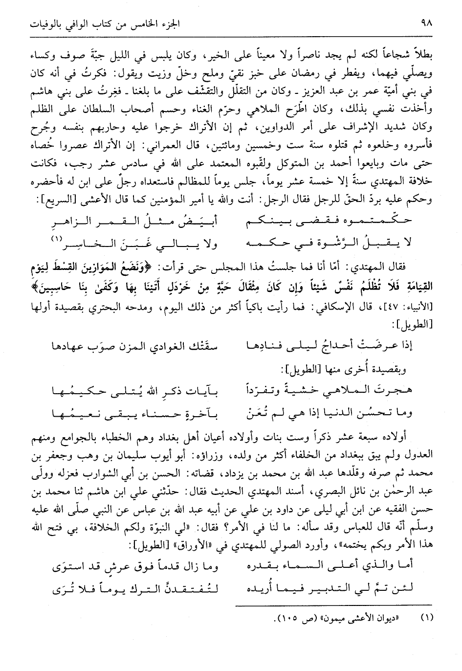 أَوْلَاده سَبْعَة عشر ذكرا وست بَنَات وَأَوْلَاده أَعْيَان أهل بغداذ وهم الخطباء بالجوامع وَمِنْهُم الْعُدُول وَلم يبْق ببغداذ من الْخُلَفَاء أَكثر من وَلَده وزراؤه أَبُو أَيُّوب بن وهب وجعفر بن مُحَمَّد ثمَّ صرفه وقلدها عبد الله بن مُحَمَّد بن يزْدَاد قُضَاته الْحسن بن أبي الشَّوَارِب فَعَزله وَولي عبد الرَّحْمَن بن نائل الْبَصْرِيّ أسْند الْمُهْتَدي الحَدِيث فَقَالَ حَدثنِي عَليّ ابْن هَاشم ثَنَا مُحَمَّد بن حسن الْفَقِيه عَن ابْن أبي ليلى عَن دَاوُد بن عَليّ عَن أَبِيه عبد الله بن عَبَّاس عَن النَّبِي صلى الله عَلَيْهِ وَسلم أَنه قَالَ للْعَبَّاس وَقد سَأَلَهُ مَا لنا فِي هَذَا الْأَمر فَقَالَ لي النُّبُوَّة وَلكم الْخلَافَة بِي فتح الله هَذَا الْأَمر وبكم يختمه وَأورد الصولي للمهتدي فِي الأوراق