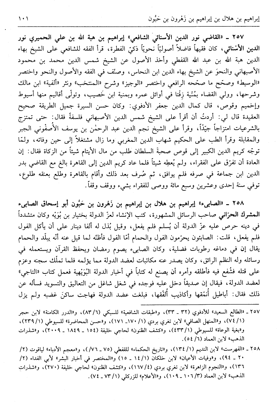 إِبْرَاهِيم بن هِلَال بن إِبْرَاهِيم بن زهرون بن حبون أَبُو إِسْحَاق الصَّابِئ الْمُشرك الْحَرَّانِي صَاحب الرسائل الْمَشْهُورَة كتب الْإِنْشَاء لعز الدولة بختيار ابْن بويه وَكَانَ متشدداً فِي دينه حرص عَلَيْهِ عز الدولة أَن يسلم فَلم يفعل وَقيل بذل لَهُ ألفا دِينَار على أَن يَأْكُل الفول فَلم يفعل قلت الصابئون يحرمُونَ الفول وَالْحمام أما الفول فأظنه لما قيل عَنهُ أَنه يبلد وَالْحمام يُقَال فِي دماغه رطوبات فضلية وَكَانَ الصَّابِئ يَصُوم رَمَضَان ويحفظ الْقُرْآن ويستعمله فِي رسائله وَله النّظم الرَّائِق وَكَانَ يصدر عَنهُ مكاتبات لعضد الدولة مِمَّا يؤلمه فَلَمَّا تملك سجنه وعزم على قَتله فشفع فِيهِ فَأَطْلقهُ وَأمره أَن يصنع لَهُ كتابا فِي أَخْبَار الدولة البويهية فَعمل كتاب التاجي لعضد الدولة فَيُقَال إِن صديقا دخل عَلَيْهِ فَوَجَدَهُ فِي شغل شاغل من التَّعَالِيق والتسويد فَسَأَلَهُ عَن ذَلِك فَقَالَ أباطيل أنمقها وأكاذيب ألفقها فبلغت عضد الدولة فهاجت سَاكن غَضَبه وَلم يزل