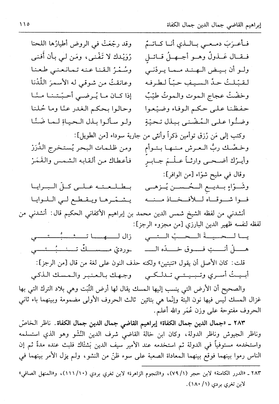 إِبْرَاهِيم القَاضِي جمال الدّين جمال الكفاة نَاظر الْخَاص وناظر الجيوش وناظر الدولة وَكَانَ ابْن خَالَة القَاضِي شرف الدّين النشو وَهُوَ الَّذِي استسلمه واستخدمه مُسْتَوْفيا فِي الدولة ثمَّ استخدمه عِنْد الْأَمِير سيف الدّين بشتاك فَلبث عِنْده مُدَّة ثمَّ إِن النَّاس رموا بَينهمَا فَوَقع بَينهمَا الْمُعَادَة الصعبة على سوء ظن من النشو وَلم يزل الْأَمر بَينهمَا فِي