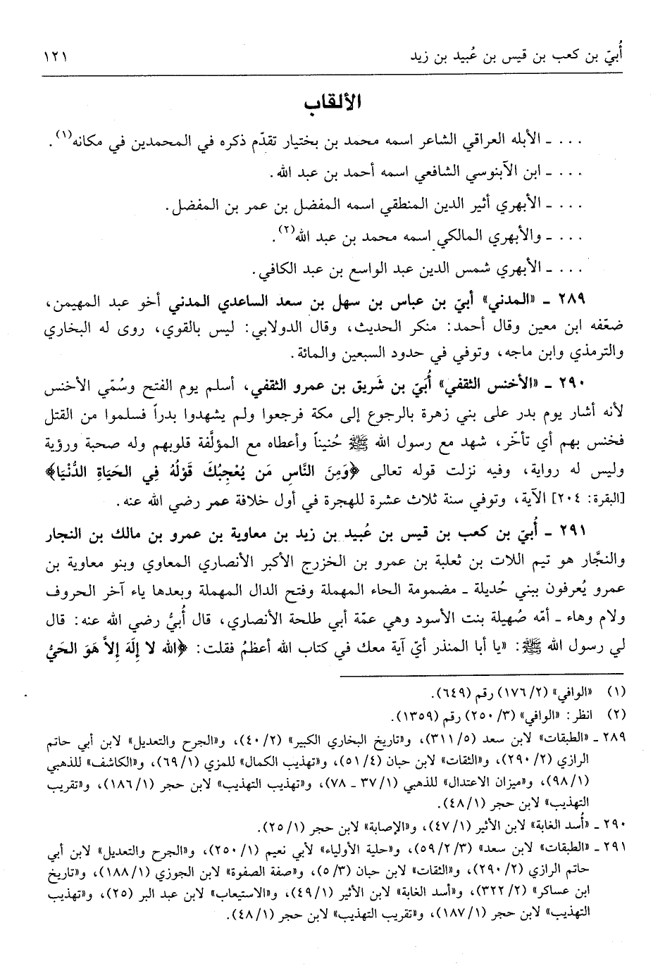أبي بن كَعْب بن قيس بن عبيد بن زيد بن مُعَاوِيَة بن عَمْرو بن مَالك ابْن النجار والنجار هُوَ تيم اللات بن ثَعْلَبَة بن عَمْرو بن الْخَزْرَج الْأَكْبَر الْأنْصَارِيّ المعاوي وَبَنُو مُعَاوِيَة بن عَمْرو يعْرفُونَ ببني حديلة مَضْمُومَة الْحَاء الْمُهْملَة وَفتح الدَّال الْمُهْملَة وَبعدهَا يَاء آخر الْحُرُوف وَلَام وهاء أمه صهيلة بنت الْأسود وَهِي عمَّة أبي طَلْحَة الْأنْصَارِيّ قَالَ أبي رَضِي الله عَنهُ قَالَ لي رَسُول الله صلّى الله عَلَيْهِ وسلّم يَا أَبَا الْمُنْذر أَي آيَة مَعَك فِي كتاب الله أعظم فَقلت الله لَا إِلَه إِلَّا هُوَ الْحَيّ
