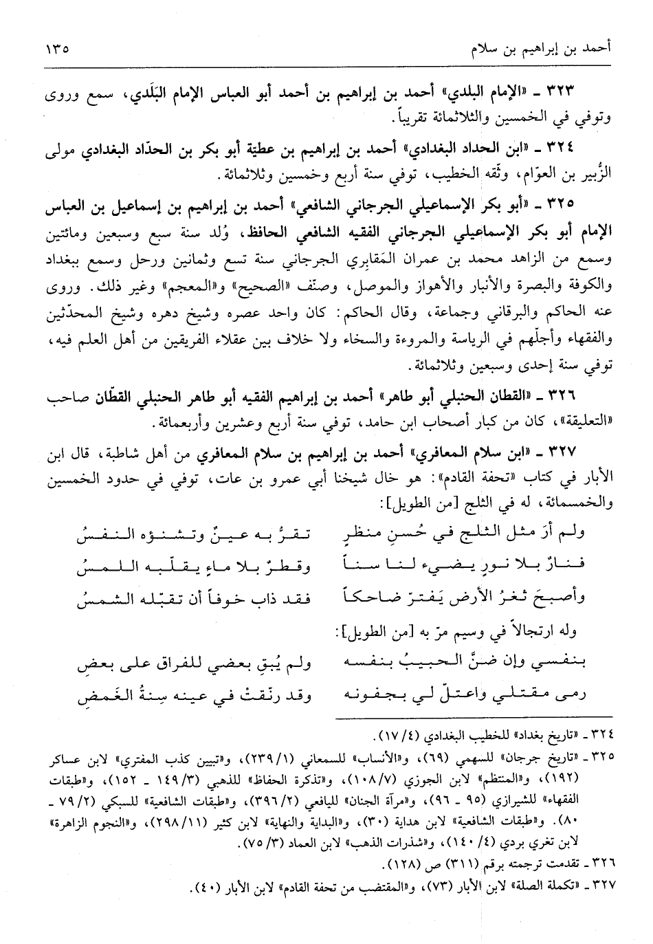 أَحْمد بن إِبْرَاهِيم بن إِسْمَاعِيل بن الْعَبَّاس الإِمَام أَبُو بكر الْإِسْمَاعِيلِيّ الْجِرْجَانِيّ الْفَقِيه الشَّافِعِي الْحَافِظ ولد سنة سبع وَسبعين وَمِائَتَيْنِ وَسمع من الزَّاهِد مُحَمَّد بن عمرَان المقابري الْجِرْجَانِيّ سنة تسع وَثَمَانِينَ ورحل وَسمع ببغداذ والكوفة وَالْبَصْرَة والأنبار والأهواز والموصل وصنف الصَّحِيح والمعجم وَغير ذَلِك وروى عَنهُ الْحَاكِم وَالْبرْقَانِي وَجَمَاعَة وَقَالَ الْحَاكِم كَانَ وَاحِد عصره وَشَيخ دهره وَشَيخ الْمُحدثين وَالْفُقَهَاء وأجلهم فِي الرياسة والمروءة والسخاء وَلَا خلاف بَين عقلاء الْفَرِيقَيْنِ من هَل الْعلم فِيهِ توفّي سنة إِحْدَى وَسبعين وَثَلَاث مائَة