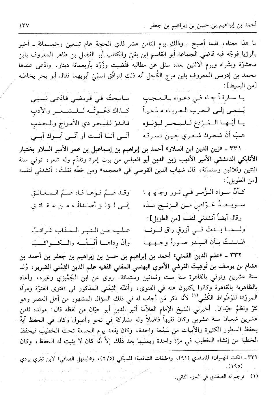 أَحْمد بن إِبْرَاهِيم بن حسن بن إِبْرَاهِيم بن جَعْفَر بن أَحْمد بن هِشَام ابْن يُوسُف بن توهيت الْقرشِي الْأمَوِي البهنسي الْمُفْتِي الْفَقِيه علم الدّين القمني الضَّرِير ولد سنة عشْرين وَتُوفِّي بِالْقَاهِرَةِ سنة سِتّ وَثَمَانِينَ وست مائَة روى عَن ابْن الجميز وَغَيره وَأعَاد بالظاهرية بِالْقَاهِرَةِ وَكَانُوا يَكْتُبُونَ عَنهُ فِي الْفَتْوَى وَأَظنهُ القمني الْمَذْكُور فِي فَتْوَى الفتوة ومرآة الْمَرْوَة للوطواط الكاتبي لِأَنَّهُ ذكر من أجَاب لَهُ فِي ذل السُّؤَال الْمَشْهُور من أهل الْعَصْر وَهُوَ نثر ونظم جيدان