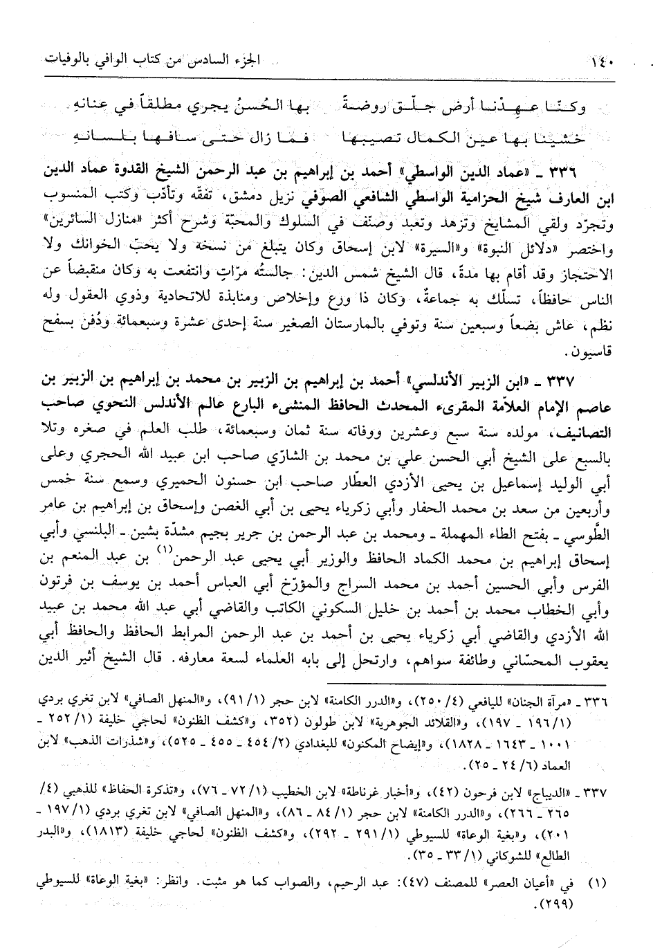 أَحْمد بن إِبْرَاهِيم بن عبد الرَّحْمَن الشَّيْخ الْقدْوَة عماد الدّين ابْن الْعَارِف شيخ الحزامية الوَاسِطِيّ الشَّافِعِي الصُّوفِي نزيل دمشق تفقه وتأدب وَكتب الْمَنْسُوب وتجرد وَلَقي الْمَشَايِخ وتزهد وَتعبد وصنف فِي السلوك والمحبة وَشرح أَكثر منَازِل السائرين وَاخْتصرَ دَلَائِل النُّبُوَّة والسيرة لِابْنِ إِسْحَاق وَكَانَ يتبلغ من نسخه وَلَا يحب الخوانك وَلَا الاحتجاز وَقد أَقَامَ بهَا مُدَّة قَالَ الشَّيْخ)