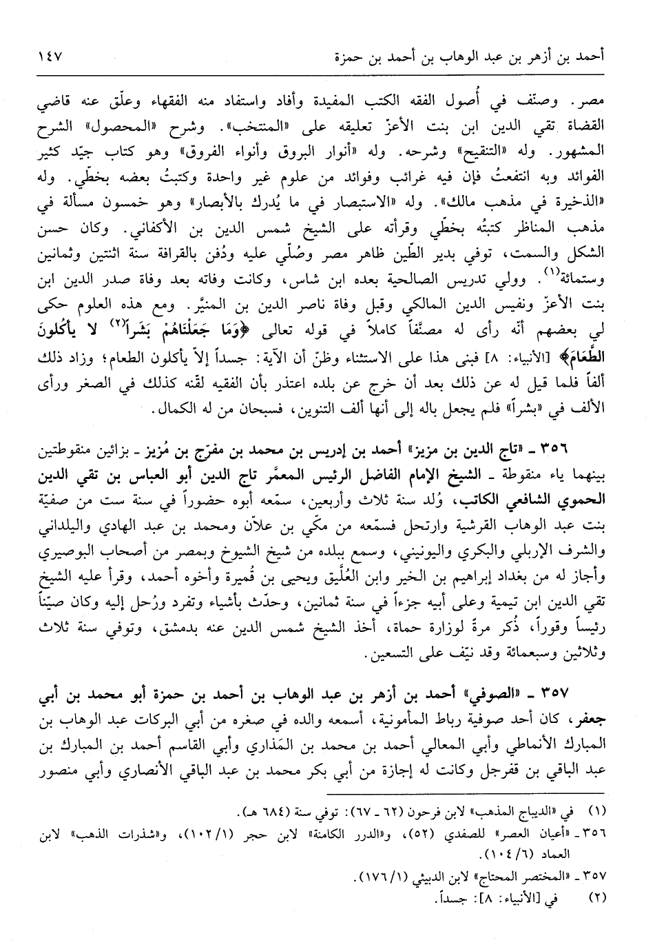 وصنف فِي أصُول الْفِقْه الْكتب المفيدة وَأفَاد واستفاد مِنْهُ الْفُقَهَاء وعلق عَنهُ قَاضِي الْقُضَاة تَقِيّ الدّين ابْن بنت الْأَعَز تَعْلِيقه على الْمُنْتَخب وَشرح الْمَحْصُول الشَّرْح الْمَشْهُور وَله التَّنْقِيح وَشَرحه وَله أنوار البروق وأنواء الفروق وَهُوَ كتاب جيد كثير الْفَوَائِد وَبِه انتفعت فَإِن فِيهِ غرائب وفوائد من عُلُوم غَيره وَاحِدَة وَكتب بعضه بخطي وَله الذَّخِيرَة فِي مَذْهَب مَالك وَله الاستبصار فِي مَا يدْرك الْأَبْصَار وَهُوَ خَمْسُونَ مَسْأَلَة فِي مَذْهَب المناظر كتبته بخطي وقرأته على الشَّيْخ شمس الدّين ابْن الْأَكْفَانِيِّ وَكَانَ حسن الشكل والسمت توفّي بدير الطين ظَاهر مصر وَصلي عَلَيْهِ وَدفن بالقرافة سنة اثْنَتَيْنِ وَثَمَانِينَ وست مائَة وَولي تدريس الصالحية عَبده ابْن شَاس وَكَانَت وَفَاته عبد وَفَاة صدر الدّين ابْن بنت الْأَعَز ونفيس الدّين الْمَالِكِي وَقبل وَفَاة نَاصِر الدّين ابْن المنثر وَمَعَ هَذِه الْعُلُوم حكى لي بَعضهم أَنه رأى لَهُ مصنفاً كَامِلا فِي قَوْله تَعَالَى وَمَا جعلناهم بشرا لَا يَأْكُلُون الطَّعَام فَبنى هَذَا على الِاسْتِثْنَاء وَظن أَن الْآيَة بشرا إِلَّا)
