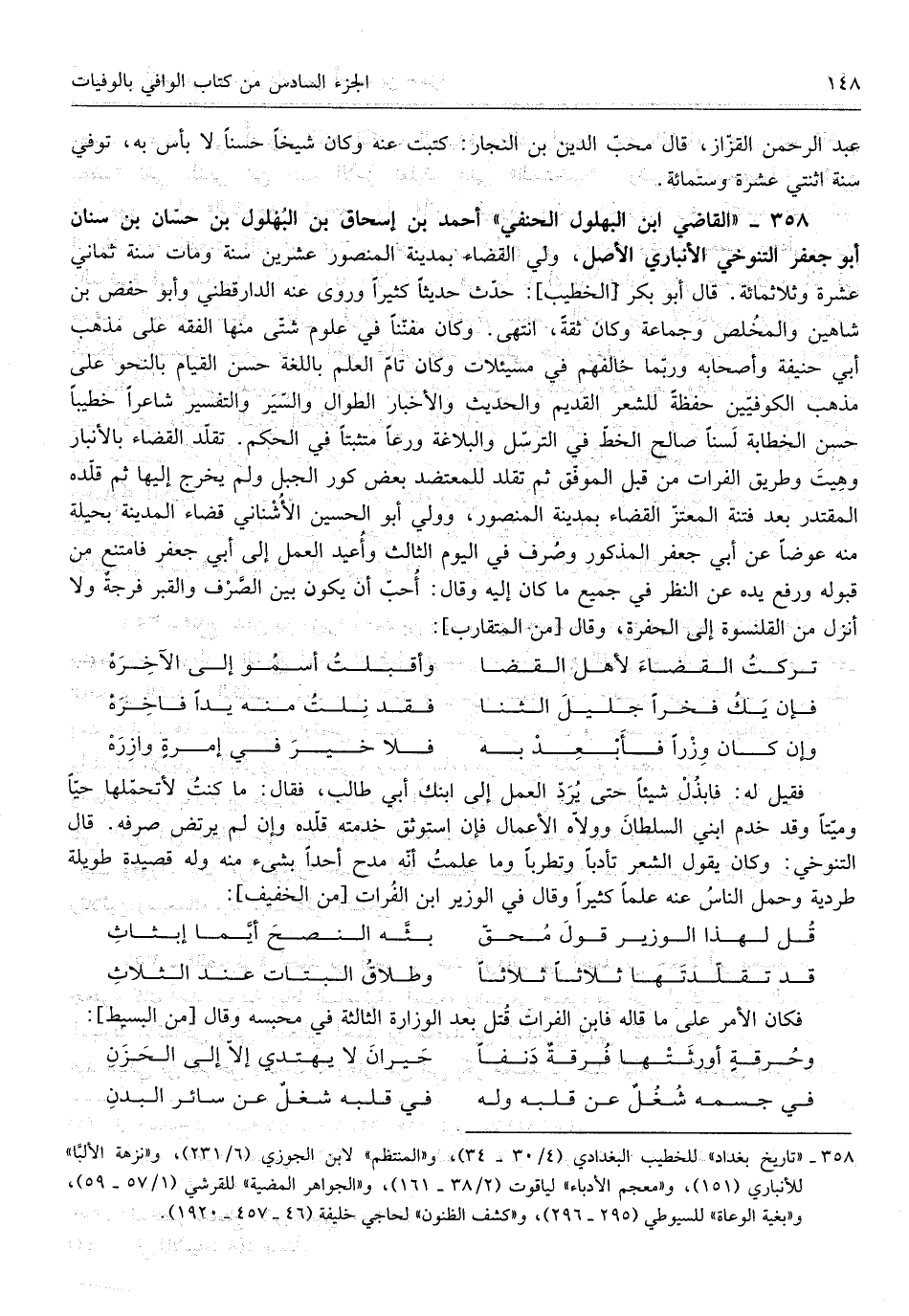 خالفهم فِي مسيئلات وَكَانَ تَامّ الْعلم باللغة حسن الْقيام بالنحو على مَذْهَب الْكُوفِيّين حفظَة للشعر الْقَدِيم والْحَدِيث وَالْأَخْبَار الطوَال وَالسير وَالتَّفْسِير شَاعِرًا خَطِيبًا حسن الخطابة لسناً صَالح الْخط فِي الترسل والبلاغة ورعاً متثبتاً فِي الحكم تقلد الْقَضَاء بالأنبار وهيت وَطَرِيق الْفُرَات من قبل الْمُوفق ثمَّ تقلد للمعتضد بعض كور الْجَبَل وَلم يخرج إِلَيْهَا ثمَّ قَلّدهُ المقتدر عبد فتْنَة المعتز الْقَضَاء بِمَدِينَة الْمَنْصُور وَولي أَبُو الْحُسَيْن الْأُشْنَانِي قَضَاء الْمَدِينَة بحيلة مِنْهُ عوضا عَن أبي جَعْفَر الْمَذْكُور وَصرف فِي الْيَوْم الثَّالِث وأعيد الْعَمَل إِلَى أبي جَعْفَر فَامْتنعَ من قبُوله وَرفع يَده عَن النّظر فِي جَمِيع مَا كَانَ إِلَيْهِ وَقَالَ أحب أَن يكون بَين الصّرْف والقبر فُرْجَة وَلَا أنزل من القلنسوة إِلَى الحفرة وَقَالَ