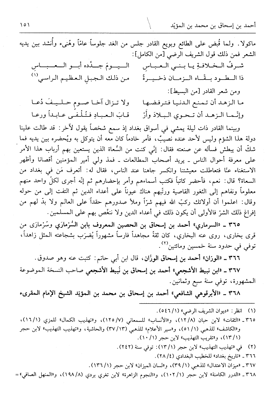 بن مَاكُولَا وَلما قبض على الطائع وبويع الْقَادِر جلس من الْغَد جُلُوسًا عَاما وهنئ وَأنْشد بَين يَدَيْهِ الشّعْر فَمن ذَلِك قَول الشريف الرضي