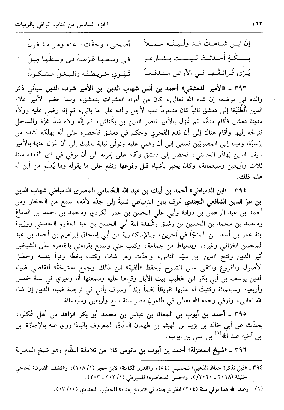 أَحْمد بن أيبك بن عبد الله الحسامي الْمصْرِيّ الدمياطي شهَاب الدّين بن عز الدّين الشَّافِعِي الجندي عرف بِابْن الدمياطي نِسْبَة إِلَى جده لأمه سمع من الحجار وَمن أَحْمد بن درادة وَأبي عَليّ الْحسن بن عمر الْكرْدِي وَمُحَمّد بن أَحْمد بن الدِّمَاغ وَمُحَمّد بن مُحَمَّد بن الْحُسَيْن بن رَشِيق وشهدة ابْنة أبي الْحسن بن عبد الْعَظِيم الحصني ووزيرة ابْنة عمر بن أسعد ابْن المنجا فِي آخَرين وبالإسكندرية من أبي إِسْحَاق إِبْرَاهِيم بن أَحْمد بن عبد المحسن الغافي وَغَيره وبدمياط من جمَاعَة وَكتب عني وَسمع بِقِرَاءَتِي بِالْقَاهِرَةِ على الشَّيْخَيْنِ أثير الدّين وَفتح الدّين ابْن سيد النَّاس وَحدث وَهُوَ شب وَكتب بِخَطِّهِ وَقَرَأَ بِنَفسِهِ وَحصل الْأُصُول وَالْفُرُوع وانتقى على الشُّيُوخ وَحفظ ألفية ابْن مَالك وَجمع مشيخة للْقَاضِي ضِيَاء الدّين يُوسُف بن أبي بكر ابْن خطيب بَيت الْآبَار وَقرأَهَا عَلَيْهِ وَسمعتهَا أَنا وغيري فِي سنة خمس وَأَرْبَعين وَسبع مائَة وكتبت لَهُ عَلَيْهَا تقريظاً نظماً ونثراً وسوف يَأْتِي فِي تَرْجَمَة ضِيَاء الدّين إِن شَاءَ الله تَعَالَى وَتُوفِّي رَحمَه الله تَعَالَى فِي طاعون مصر سنة تسع وَأَرْبَعين وَسبع مائَة