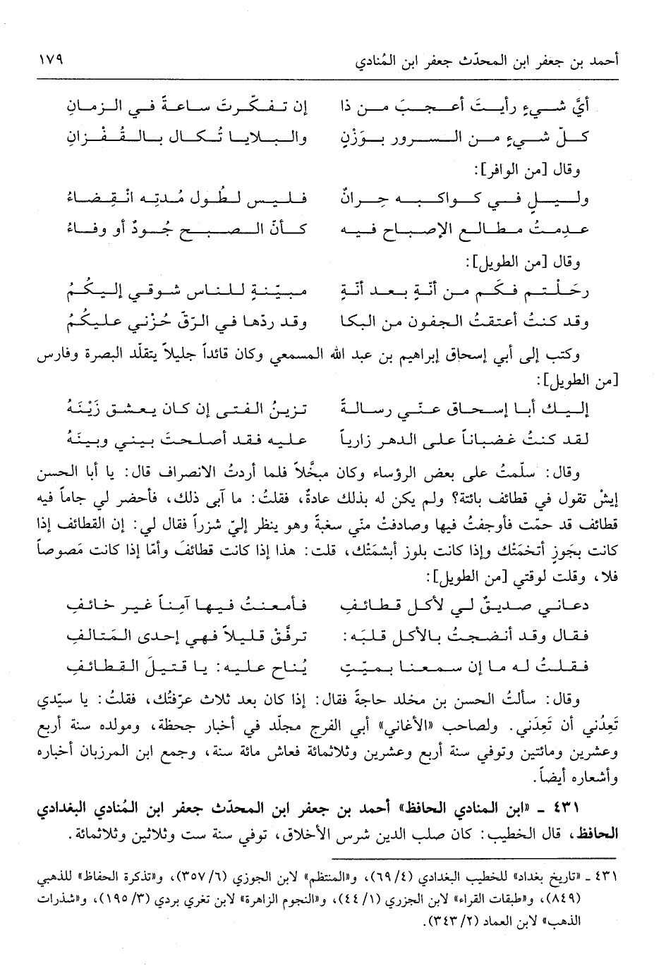 أَحْمد بن جَعْفَر ابْن الْمُحدث جَعْفَر ابْن الْمُنَادِي البغداذي الْحَافِظ قَالَ الْخَطِيب كَانَ صلب الدّين شرس الْأَخْلَاق توفّي سنة سِتّ وَثَلَاثِينَ وَثَلَاث مائَة