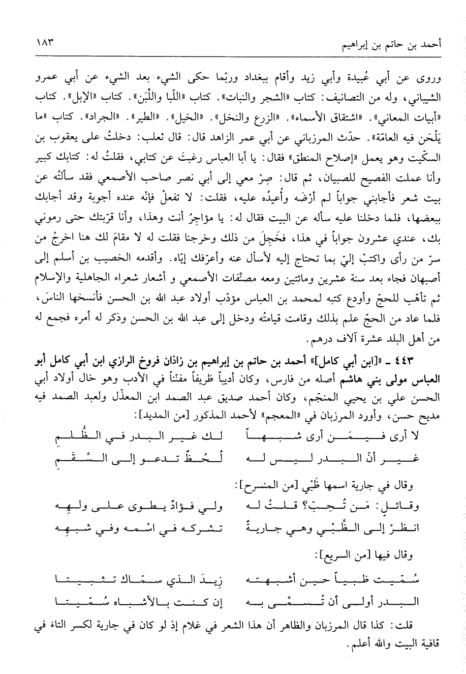 أَحْمد بن حَاتِم بن إِبْرَاهِيم بن زَاذَان فروخ الرَّازِيّ ابْن أبي كَامِل أَبُو الْعَبَّاس مولى بني هَاشم أَصله من فَارس وَكَانَ أديباً ظريفاً مفنناً فِي الْأَدَب وَهُوَ خَال أَوْلَاد أبي الْحسن عَليّ بن يحيى)