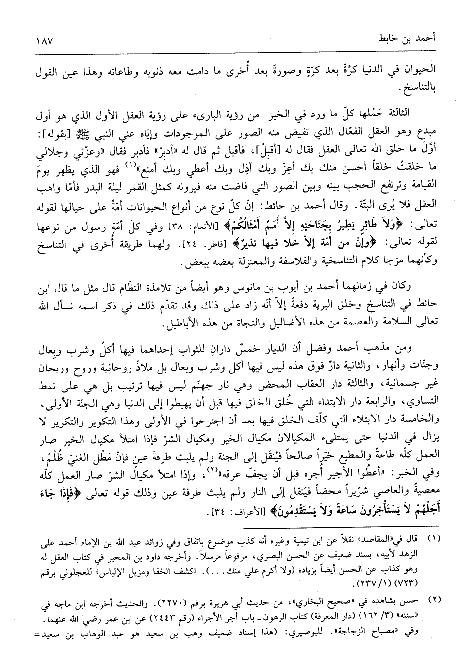 وَمن مَذْهَب أَحْمد وَفضل أَن الديار خمس داران للثَّواب إِحْدَاهمَا فِيهَا أكل وَشرب وبعال وجنات وأنهار وَالثَّانيَِة دَار فَوق هَذِه لَيْسَ فِيهَا أكل وَشرب وبعال بل ملاذ روحانية وروح)