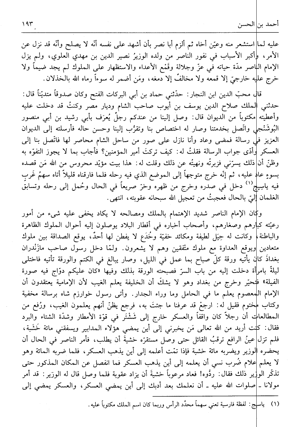 عَلَيْهِ لما استشعر مِنْهُ وَعين أَخَاهُ ثمَّ ألزم أَبَا نصر بِأَن أشهد على نَفسه أَنه لَا يصلح وَأَنه قد نزل عَن الْأَمر وأكبر الْأَسْبَاب فِي نفور النَّاصِر من وَلَده الْوَزير نصير الدّين ابْن مهْدي الْعلوِي وَلم يزل الإِمَام النَّاصِر مُدَّة حَيَاته فِي عز وجلالة وقمع الْأَعْدَاء والاستظهار على الْمُلُوك لم يجد ضيماً وَلَا خرج عَلَيْهِ خارجي إِلَّا قمعه وَلَا مُخَالف إِلَّا دمغه وَمن أضمر لَهُ سوءا رَمَاه الله بالخذلان قَالَ محب الدّين ابْن النجار حدثين حَمَّاد بن أبي البركات الْفَتْح وَكَانَ صَدُوقًا متديناً قَالَ حَدثنِي الْملك صَلَاح الدّين يُوسُف بن أَيُّوب صَاحب الشَّام وديار مصر وَكنت قد دخلت عَلَيْهِ وأعطيته مَكْتُوبًا من الدِّيوَان قَالَ وصل إِلَيْنَا من عنْدكُمْ رجل يعرف بِأبي رشيد ابْن أبي مَنْصُور البوشنجي واتصل بخدمتنا وَصَارَ لَهُ اخْتِصَاص بِنَا وتقرب إِلَيْنَا وَحسن حَاله)
