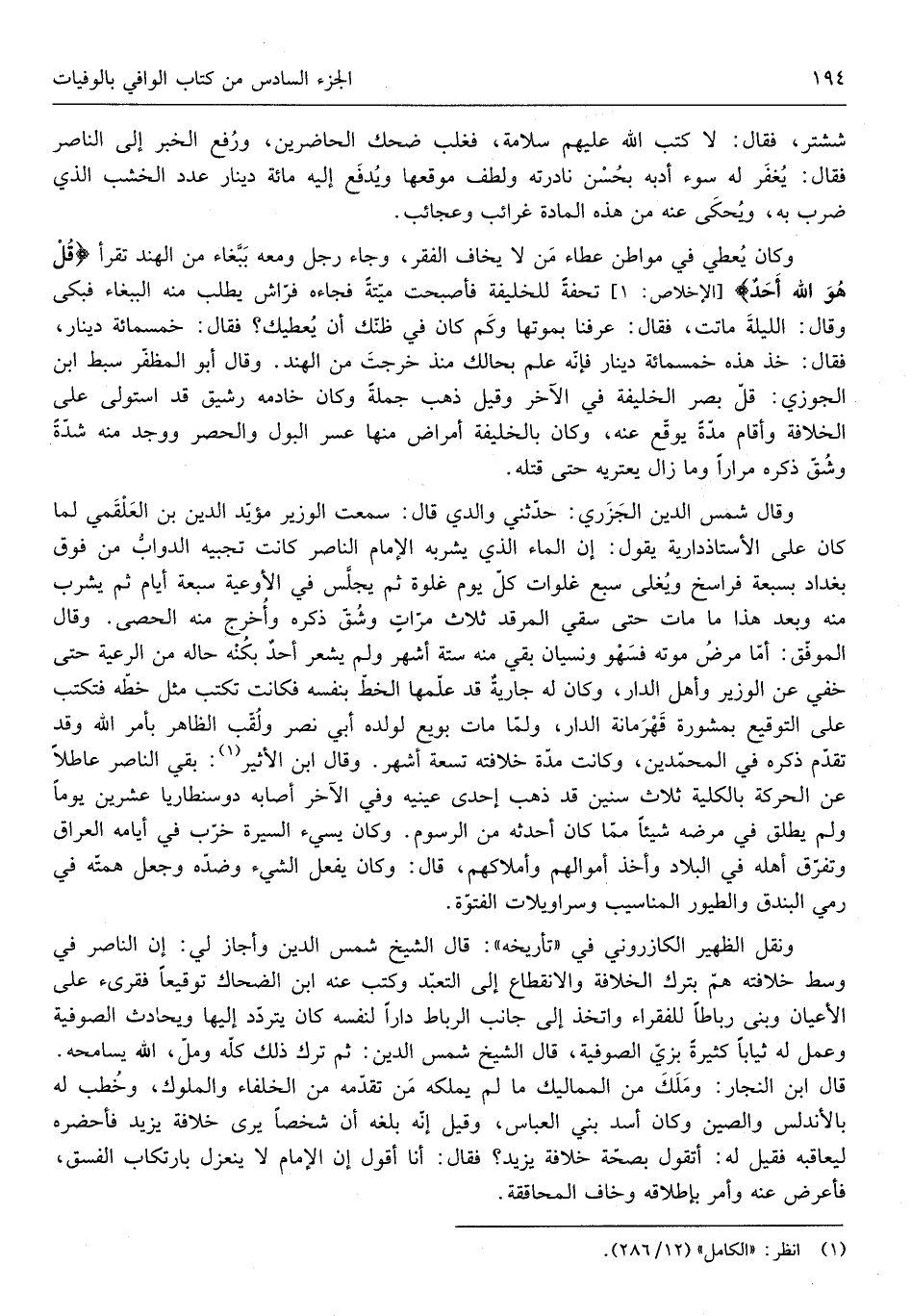 الْمَادَّة غرائب وعجائب وَكَانَ يُعْطي فِي مَوَاطِن عَطاء من لَا يخَاف الْفقر وَجَاء رجل وَمَعَهُ ببغاء من الْهِنْد تقْرَأ قل هُوَ الله أحد تحفة للخليفة فَأَصْبَحت ميتَة فَجَاءَهُ فرَاش يطْلب مِنْهُ الببغاء فَبكى وَقَالَ اللَّيْلَة مَاتَت فَقَالَ عرفنَا بموتها وَكم كَانَ فِي ظَنك أَن يعطيك فَقَالَ خمس مائَة دِينَار فَقَالَ خُذ هَذِه خمس مائَة دِينَار فَإِنَّهُ علم بحالك مُنْذُ خرجت من الْهِنْد وَقَالَ أَبُو المظفر سبط ابْن الْجَوْزِيّ قل بصر الْخَلِيفَة فِي الآخر وَقيل ذهب جملَة وَكَانَ خادمه ريق قد استولى على الْخلَافَة وَقَامَ مُدَّة يُوقع عَنهُ وَكَانَ بالخليفة أمراض مِنْهَا عسر الْبَوْل والحصر وَوجد مِنْهُ شدَّة وشق ذكره مرَارًا وَمَا زَالَ يَعْتَرِيه حَتَّى قَتله وَقَالَ شمس الدّين الْجَزرِي حَدثنِي وَالِدي قَالَ سَمِعت الْوَزير مؤيد الدّين ابْن العلقمي لما كَانَ على الأستاذدارية يَقُول إِن المَاء الَّذِي يشربه الإِمَام النَّاصِر كَانَت تجبيه الدَّوَابّ من فَوق بغداذ بسبعة فراسخ ويغلى سبع غلوات كل يَوْم غلوة ثمَّ يجلس فِي الأوعية سَبْعَة أَيَّام ثمَّ يشرب مِنْهُ وَبعد هَذَا مَا مَاتَ حَتَّى سقِِي المرقد ثَلَاث مَرَّات وشق ذكره وَأخرج مِنْهُ الْحَصَى وَقَالَ الْمُوفق مَا مرض مَوته فسهو ونسيان بَقِي مِنْهُ سِتَّة أشهر وَلم يشْعر أحد بكنه حَاله من الرّعية حَتَّى خَفِي عَن الْوَزير وَأهل الدَّار وَكَانَ لَهُ جَارِيَة قد علمهَا الْخط بِنَفسِهِ فَكَانَت تكْتب مثل خطه فتكتب على التوقيع بمشورة قهرمانة الدَّار وَلما مَاتَ بُويِعَ لوَلَده أبي نصر ولقب الظَّاهِر بِأَمْر الله وَقد تقدم ذكره فِي المحمدين وَكَانَت مُدَّة خِلَافَته تِسْعَة أشهر وَقَالَ ابْن الْأَثِير بَقِي النَّاصِر عاطلاً عَن الْحَرَكَة بِالْكُلِّيَّةِ ثَلَاث سِنِين قد ذهب إِحْدَى عَيْنَيْهِ وَفِي الآخر أَصَابَهُ دوسنطاريا عشْرين يَوْمًا وَلم يُطلق فِي مَرضه شَيْئا مِمَّا كَانَ أحدثه من الرسوم وَكَانَ يسيء السِّيرَة خرب فِي أَيَّامه الْعرَاق وتفرق أَهله فِي الْبِلَاد وَأخذ أَمْوَالهم وأملاكهم قَالَ وَكَانَ يفعل الشَّيْء وضده وَجعل همته فِي رمي البندق والطيور المناسيب وسراويلات الفتوة وَنقل الظهير الكازروني فِي تأريخه قَالَ الشَّيْخ شمس الدّين وَأَجَازَ لي إِن النَّاصِر فِي وسط خِلَافَته هم بترك الْخلَافَة والانقطاع إِلَى التَّعَبُّد وَكتب عَنهُ ابْن الضَّحَّاك توقيعاً فقرئ على الْأَعْيَان وَبنى رِبَاطًا للْفُقَرَاء وَاتخذ إِلَى جَانب الرِّبَاط دَارا لنَفسِهِ كَانَ يتَرَدَّد إِلَهًا ويحادث الصُّوفِيَّة وَعمل لَهُ ثيابًا كَثِيرَة بزِي الصُّوفِيَّة قَالَ الشَّيْخ شمس الدّين ثمَّ ترك ذَلِك كُله ومل الله يسامحه قَالَ ابْن النجار وَملك من المماليك مَا لم يملكهُ من تقدمه من الخفاء والملوك وخطب لَهُ بالأندلس والصين وَكَانَ أَسد بني الْعَبَّاس وَقيل إِنَّه بلغه أَن شخصا يرى خلَافَة يزِيد فَأحْضرهُ ليعاقبه فَقيل لَهُ أَتَقول بِصِحَّة)
