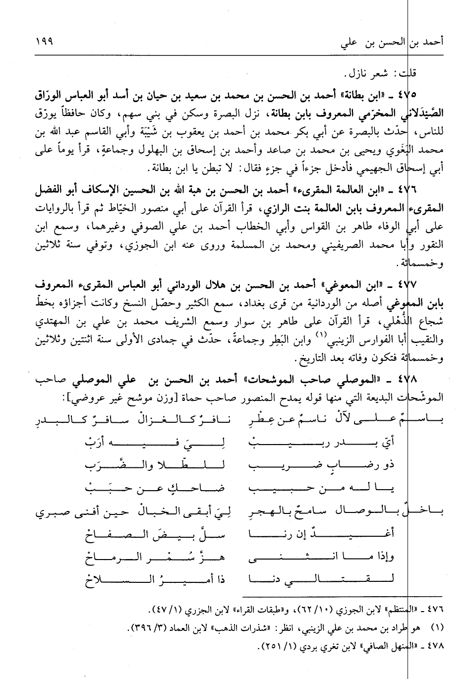 أَحْمد بن الْحسن بن عَليّ الْموصِلِي صَاحب الموشحات البديعية الَّتِي مِنْهَا قَوْله يمدح الْمَنْصُور صَاحب حماة باسم عَن لآلناسم عَن عطرنافر كالغزالسافر كالبدر