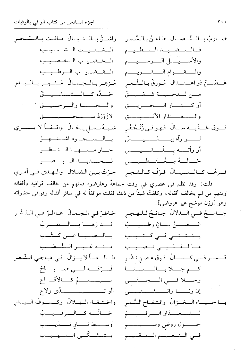 فَرعه كالليلفرقه كالفجرحرت بَين الضلالوالهدى فِي أَمْرِي قلت وَقد نظم فِي عصري فِي وَقت جمَاعَة وعارضوه فَمنهمْ من خَالف قوافيه وأقفاله وَمِنْهُم من لم يُخَالف أقفاله وكلفت شَيْئا من ذَلِك فَقلت مُوَافقا لَهُ فِي سَائِر أقفاله وقوافي حشواته وَهُوَ جَامع فِي الدلالجانح للهجرخاطر فِي الجمالعاطر فِي النشر