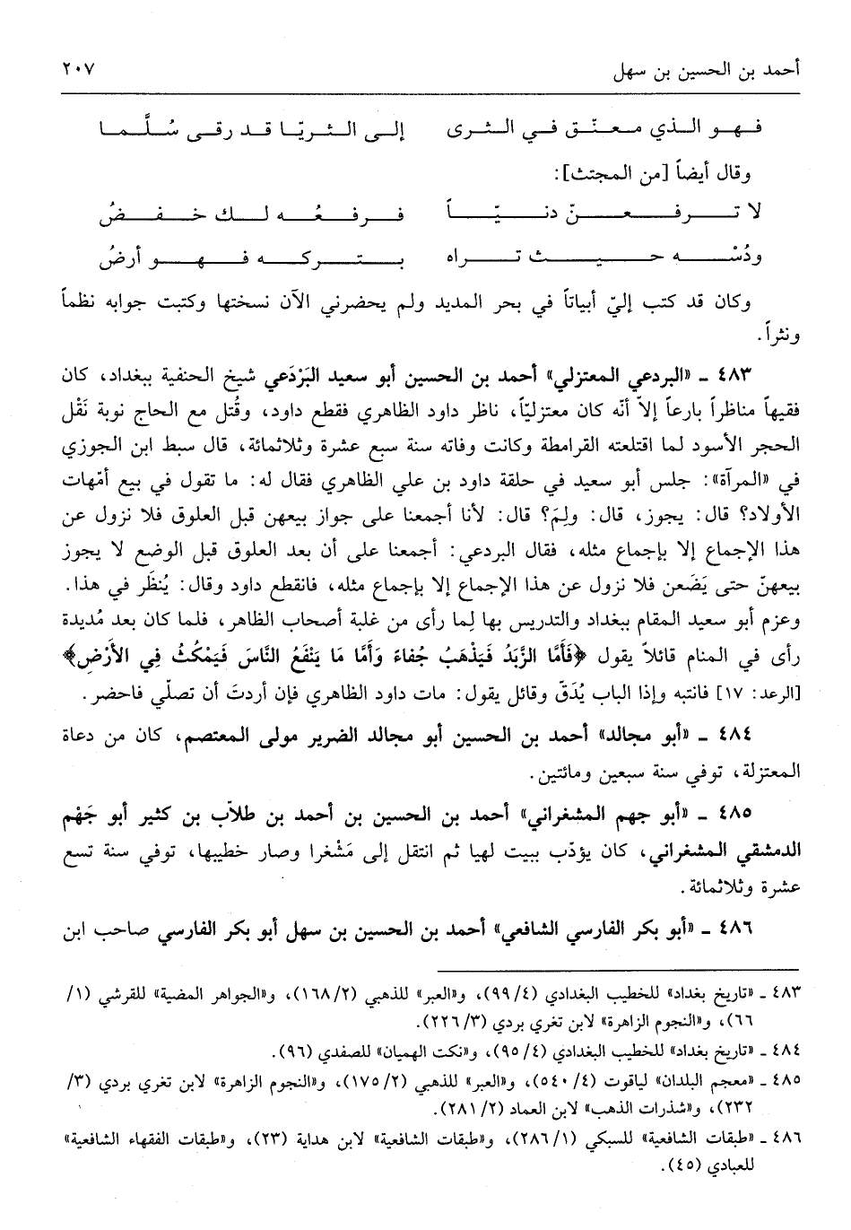 أَحْمد بن الْحُسَيْن أَبُو سعيد البردعي شيخ الْحَنَفِيَّة ببغداذ كَانَ فَقِيها مناظراً بارعاً إِلَّا أَنه كَانَ معتزلياً نَاظر دَاوُد الظَّاهِرِيّ فَقطع دَاوُد وَقتل مَعَ الْحَاج نوبَة نقل الْحجر الْأسود لما اقتلعته القرامطة وَكَانَت وَفَاته سنة سبع عشرَة وَثَلَاث مائَة قَالَ سبط ابْن الْجَوْزِيّ فِي الْمرْآة جلس أَبُو سعيد فِي حَلقَة دَاوُد بن عَليّ الظَّاهِرِيّ فَقَالَ لَهُ مَا تَقول فِي بيع أُمَّهَات الْأَوْلَاد قَالَ يجوز قَالَ وَلم قَالَ لأَنا أجمعنا على جَوَاز بيعهنَّ قبل الْعلُوق فَلَا نزُول عَن هَذَا الْإِجْمَاع إِلَّا بِإِجْمَاع مثله فَقَالَ البردعي أجمعنا على أَن بعد الْعلُوق قبل الْوَضع لَا يجوز بيعهنَّ حَتَّى يَضعن فَلَا نزُول عَن هَذَا الْإِجْمَاع إِلَّا بِإِجْمَاع مثله فَانْقَطع دَاوُد وَقَالَ ينظر فِي هَذَا وعزم أَبُو سعيد الْمقَام ببغداذ والتدريس بهَا لما رأى من غَلَبَة أَصْحَاب الظَّاهِر فَلَمَّا كَانَ بعد مديدة رأى فِي الْمَنَام قَائِلا يَقُول فَأَما الزّبد فَيذْهب جفَاء وَأما مَا ينفع النَّاس فيمكث فِي الأَرْض فانتبه وَإِذا الْبَاب يدق وَقَائِل يَقُول مَاتَ دَاوُد الظَّاهِرِيّ فَإِن أردْت أَن تصلي فَاحْضُرْ