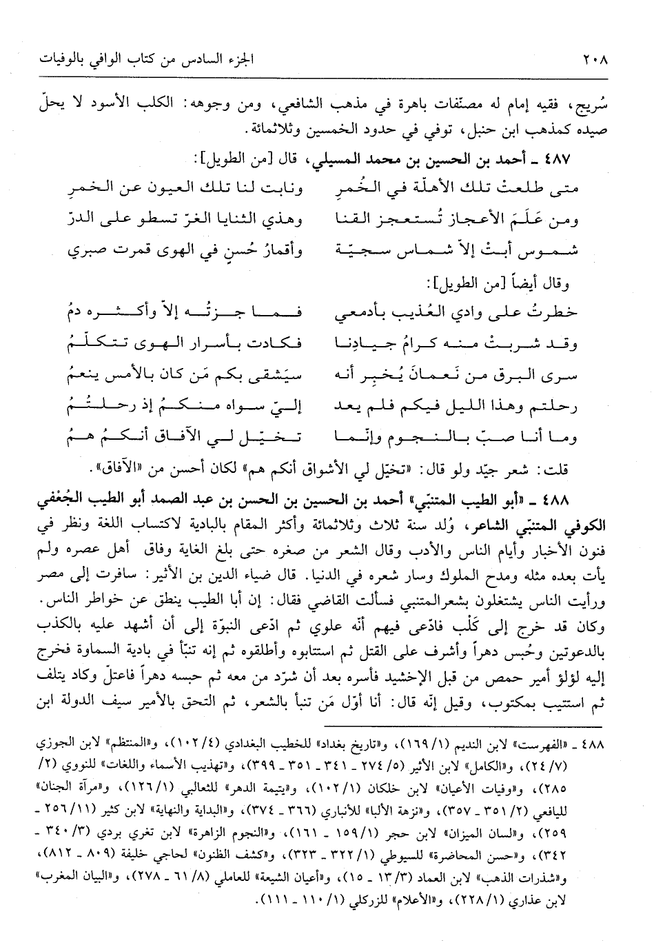 أَحْمد بن الْحُسَيْن بن الْحسن بن عبد الصَّمد أَبُو الطّيب الْجعْفِيّ الْكُوفِي المتنبي الشَّاعِر ولد سنة ثَلَاث وَثَلَاث مائَة وَأكْثر الْمقَام بالبادية لِاكْتِسَابِ اللُّغَة وَنظر فِي فنون الْأَخْبَار وَأَيَّام النَّاس وَالْأَدب وَقَالَ الشّعْر من صغره حَتَّى بلغ الْغَايَة وفَاق أهل عصره وَلم يَأْتِ بعده مثله ومدح)