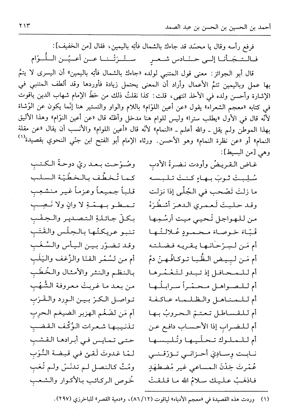 قَالَ أَبُو الجوائز معنى قَول المتنبي لوَلَده جَاءَك بالشمال فأته بِالْيَمِينِ أَن الْيُسْرَى لَا يتم بهَا عمل وباليمين تتمّ الْأَعْمَال وَأَرَادَ أَن الْمَعْنى يحْتَمل زِيَادَة فأوردها وَقد ألطف المتنبي فِي الْإِشَارَة وَأحسن وَلَده فِي الْأَخْذ انْتهى قلت كَذَا نقلت ذَلِك من خطّ الإِمَام شهَاب الدّين ياقوت فِي كِتَابه مُعْجم الشُّعَرَاء يَقُول عَن أيعن اللوام بِاللَّامِ وَالْوَاو والتستير هُنَا إِنَّمَا يكون عَن الوشاة لِأَنَّهُ قَالَ فِي الأول يطْلب سترا وَلَيْسَ للوام هُنَا مدْخل وَأَظنهُ قَالَ عَن أعين النوام وَهَذَا الْأَلْيَق بِهَذَا الموطن وَلم يقل وَالله أعلم النمام لِأَنَّهُ قَالَ أعين اللوام والأنسب أَن يُقَال عَن مقلة النمام أَو عَن نظرة النمام وَهُوَ الْأَحْسَن ورثاه الإِمَام أَبُو الْفَتْح ابْن جني النَّحْوِيّ بقصيدة وَهِي