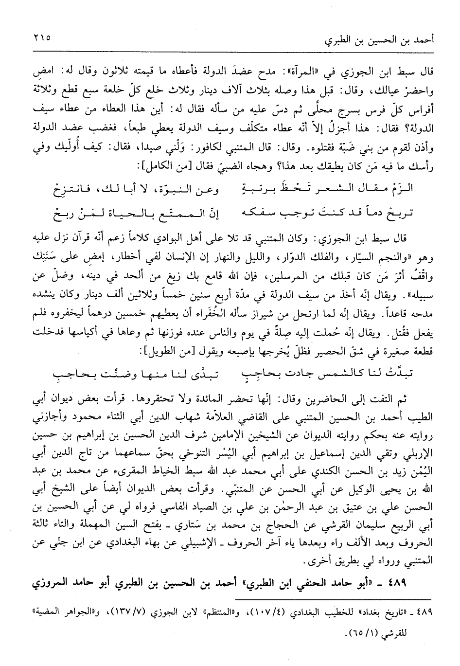 قَالَ سبط ابْن الْجَوْزِيّ وَكَانَ المتنبي قد تَلا على أهل الْبَوَادِي كلَاما زعم أَنه قُرْآن نزل عَلَيْهِ)