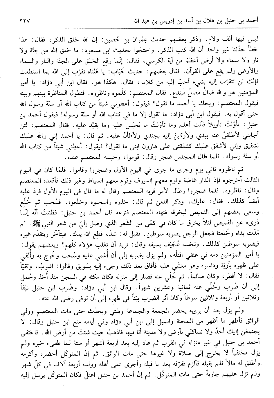 الْقُرْآن فَقَالَ بَعضهم حَدِيث خباب يَا هنتاه تقرب إِلَى الله بِمَا اسْتَطَعْت فَإنَّك لن تتقرب إِلَيْهِ بِشَيْء أحب إِلَيْهِ من كَلَامه فَقَالَ هَكَذَا هُوَ فَقَالَ ابْن أبي دواد يَا أَمِير الْمُؤمنِينَ هُوَ وَالله ضال مضل مُبْتَدع فَقَالَ المعتصم كَلمُوهُ وناظروه فتطول المناظرة بَينهم وَبَينه فَيَقُول المعتصم وَيحك يَا أَحْمد مَا تَقول فَيَقُول أعطوني شَيْئا من كتاب الله أَو سنة رَسُول الله حَتَّى أَقُول بِهِ فَيَقُول ابْن أبي دواد مَا تَقول إِلَّا مَا فِي كتاب الله أَو سنة رَسُوله فَيَقُول أَحْمد ابْن حَنْبَل تأولت تَأْوِيلا فَأَنت أعلم وَمَا تأولت مَا يحبس عَلَيْهِ وَمَا يُقيد عَلَيْهِ فَقَالَ المعتصم لَئِن أجابني لأطلقن عَنهُ بيَدي ولأركبن إِلَيْهِ بجندي ولأطأن عقبه ثمَّ قَالَ يَا أَحْمد إِنِّي وَالله عَلَيْك لشفيق وَإِنِّي لأشفق عَلَيْك كشفقتي على هَارُون ابْني مَا تَقول فَيَقُول أَعْطِنِي شَيْئا من كتاب الله أَو سنة رَسُوله فَلَمَّا طَال الْمجْلس ضجر وَقَالَ قومُوا وحبسه المعتصم عِنْده ثمَّ ناظروه ثَانِي يَوْم وَجرى مَا جرى فِي الْيَوْم الأول وضجروا وَقَامُوا فَلَمَّا كَانَ فِي الْيَوْم الثَّالِث أَخْرجُوهُ فَإِذا الدَّار غاصة وَقوم مَعَهم السيوف وَقوم مَعَهم السِّيَاط وَغير ذَلِك فأقعده المعتصم وقلا ناظروه فَلَمَّا ضجروا وَطَالَ الْأَمر قربه المعتصم ونقال لَهُ مَا قَالَ فِي الْيَوْم الأول فَرد عَلَيْهِ أَيْضا كَذَلِك فَقَالَ عَلَيْك وَذكر اللَّعْن ثمَّ قَالَ خذوه واسحبوه وخلعوه فسحب ثمَّ خلع وسعى بَعضهم إِلَى الْقَمِيص ليخرقه فَنَهَاهُ المعتصم فَنَزَعَهُ قَالَ أَحْمد بن حَنْبَل فَظَنَنْت أَنه إِنَّمَا ذرئ عَن الْقَمِيص لِئَلَّا يخرق مَا كَانَ فِي كمتي من الشّعْر الَّذِي وصل إِلَيّ من شعر النَّبِي صلى الله عَلَيْهِ وَسلم ثمَّ مدت يَدَاهُ وخلعتا فَجعل الرجل يضْربهُ سوطين فَقيل لَهُ شدّ قطع الله يدك