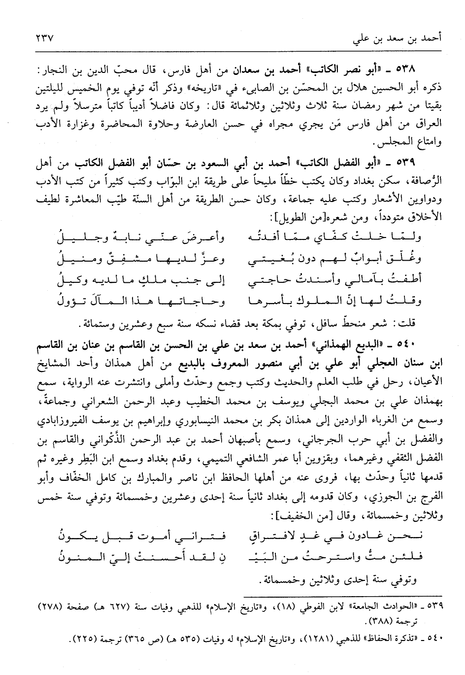 أَحْمد بن أبي السُّعُود بن حسان أَبُو الْفضل الْكَاتِب من أهل الرصافة سكن بغداذ وَكَانَ يكْتب خطا مليحاً على طَريقَة ابْن البواب وَكتب كثيرا من كتب الْأَدَب ودواوين الْأَشْعَار وَكتب عَلَيْهِ جمَاعَة وَكَانَ حسن الطَّرِيقَة من أهل السّنة طيب المعاشرة لطيف الْأَخْلَاق متودداً وَمن شعره