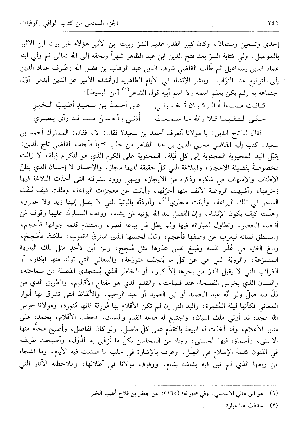 وَاجْتمعَ لَهُ طَاعَة الْقَلَم وَاللِّسَان فَخَطب الأقلام بِحَمْدِهِ قد أُوتِيَ ملك الْبَيَان وَاجْتمعَ لَهُ طَاعَة الْقَلَم وَاللِّسَان فَخَطب الأقلام بِحَمْدِهِ على مَنَابِر الْأَعْلَام وَقد أخذت لَهُ الْبيعَة بالتقدم على كل فَاضل وَلَو كَانَ الْفضل وأًبح مَحَله مِنْهَا الْأَسْنَى وأسماؤه فِيهَا الْحسنى وَجَاء من المحاسن بِكُل مَا تزهى بِهِ الدول وأصبحت طَرِيقَته فِي الْفُنُون كلمة الْإِسْلَام فِي الْملَل وَعرف بِالْإِشَارَةِ فِي حلب مَا صنعت فِيهِ الْأَيَّام وَمَا أشجاه من ربعهَا الَّذِي لم تبْق فِيهِ بشاشة بشام ووقوف)