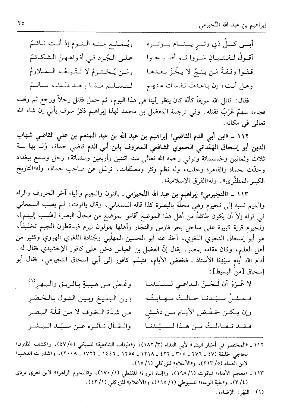 إِبْرَاهِيم بن عبد الله بن عبد الْمُنعم بن عَليّ القَاضِي شهَاب الدّين أَبُو إِسْحَاق الْهَمدَانِي الْحَمَوِيّ الشَّافِعِي الْمَعْرُوف بِابْن أبي الدَّم قَاضِي حماة ولد بهَا سنة ثَلَاث وَثَمَانِينَ وَخمْس مائَة وَتُوفِّي رَحمَه الله تَعَالَى سنة اثْنَتَيْنِ وَأَرْبَعين وست مائَة رَحل وَسمع ببغداذ وَحدث بحماة والقاهرة وحلب وَله نظم ونثر ومصنفات ترسل عَن صَاحب حماة وَله التَّارِيخ الْكَبِير المظفري وَله الْفرق الإسلامية)