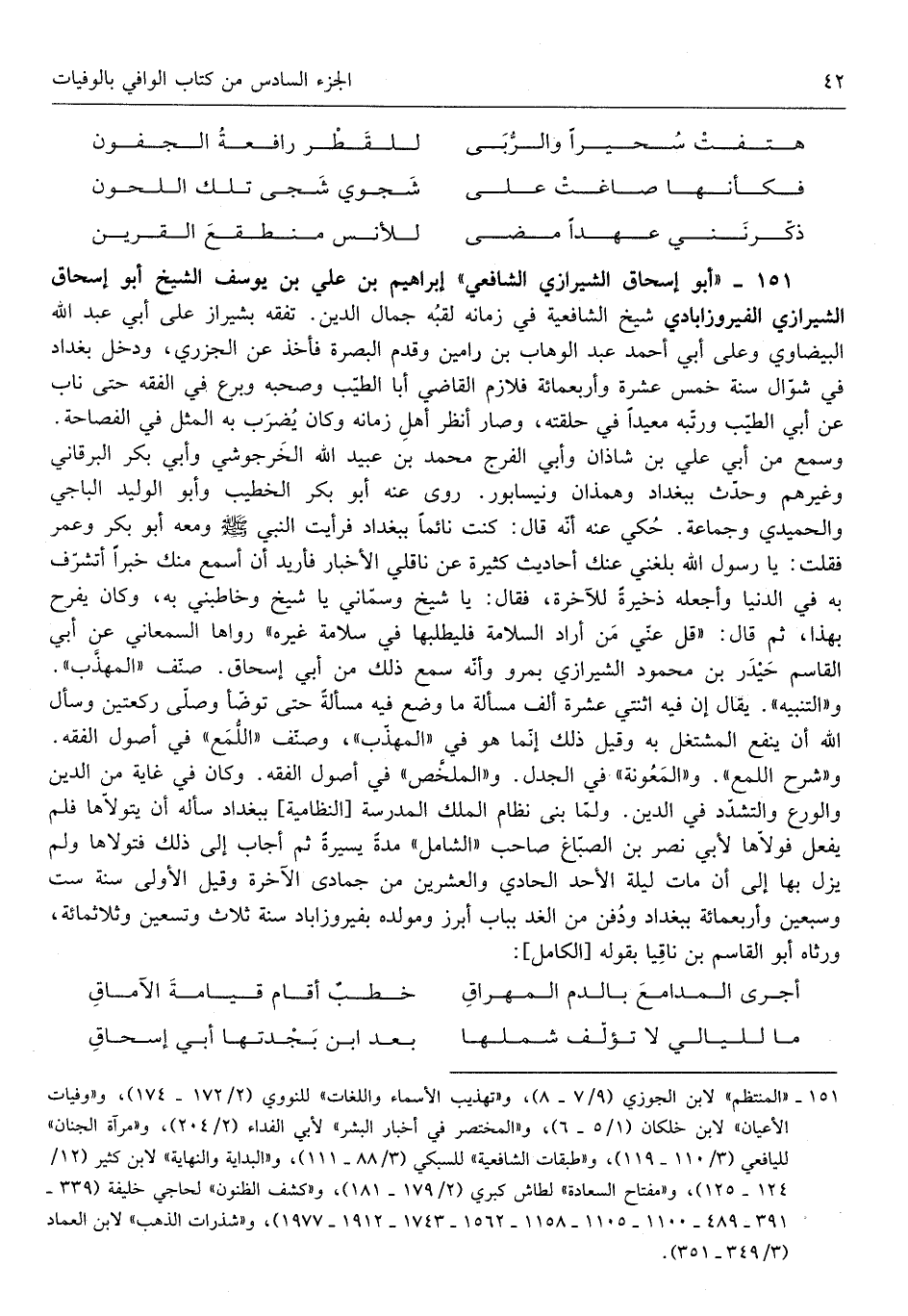 وخاطبني بِهِ وَكَانَ يفرح بِهَذَا ثمَّ قَالَ قل عني من أَرَادَ السَّلامَة فليطلبها فِي سَلامَة غَيره رَوَاهَا السَّمْعَانِيّ عَن أبي الْقَاسِم حيدر بن مَحْمُود الشِّيرَازِيّ بمرو وَأَنه سمع ذَلِك من أبي إِسْحَاق صنف الْمُهَذّب والتنبيه يُقَال إِن فِيهِ اثْنَتَيْ عشرَة ألف مَسْأَلَة مَا وضع فِيهِ مَسْأَلَة حَتَّى تَوَضَّأ وَصلى رَكْعَتَيْنِ وَسَأَلَ الله أَن ينفع المشتغل بِهِ وَقيل ذَلِك إِنَّمَا هُوَ فِي الْمُهَذّب وصنف اللمع فِي أصُول الْفِقْه وَشرح اللمع والمعونة فِي الجدل والملخص فِي أصُول الْفِقْه وَكَانَ فِي غَايَة من الدّين والروع والتشدد فِي الدّين وَلما بنى نظام الْملك الْمدرسَة النظامية ببغداذ سَأَلَهُ أَن يتولاها فَلم يفعل فولاها لأبي نصر بن الصّباغ صَاحب الشَّامِل مُدَّة يسيرَة ثمَّ أجَاب إِلَى ذَلِك فتولاها وَلم يزل بهَا إِلَى أَن مَاتَ لَيْلَة الْأَحَد الْحَادِي وَالْعِشْرين من جُمَادَى الْآخِرَة وَقيل الأولى سنة سِتّ وَسبعين وَأَرْبع مائَة ببغداذ وَدفن من الْغَد بِبَاب أبرز ومولده بفيروزاباد سنة ثَلَاث وَتِسْعين وَثَلَاث مائَة ورثاه أَبُو الْقَاسِم بن ناقيا بقوله