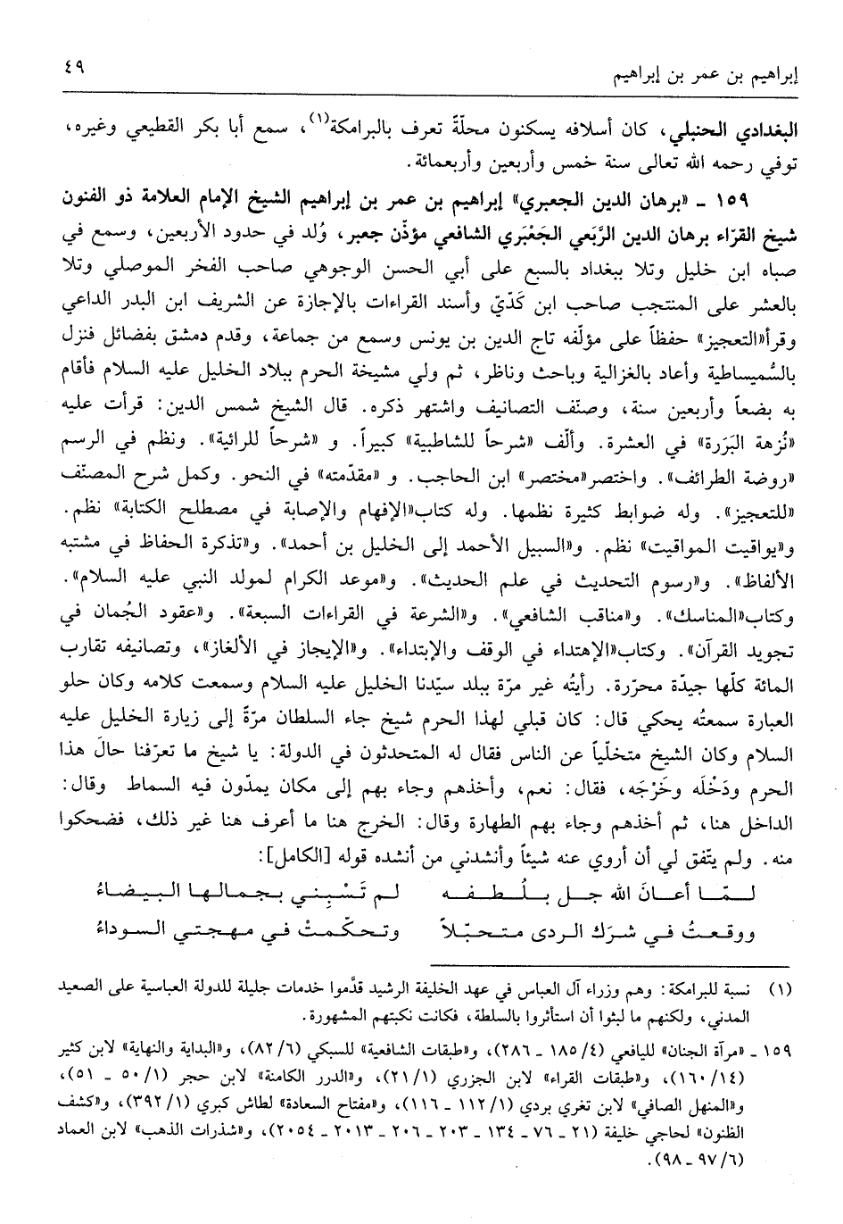 إِبْرَاهِيم بن عمر بن إِبْرَاهِيم الشَّيْخ الإِمَام الْعَلامَة ذُو الْفُنُون شيخ الْقُرَّاء برهَان الدّين الربعِي الجعبري الشَّافِعِي مُؤذن جعبر ولد فِي حُدُود الْأَرْبَعين وَسمع فِي صباه ابْن خَلِيل وتلا ببغداذ)