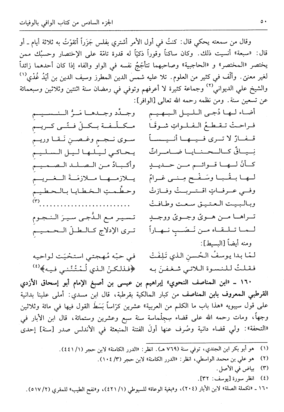 إِبْرَاهِيم بن عِيسَى بن أصبغ الإِمَام أَبُو إِسْحَاق الْأَزْدِيّ الْقُرْطُبِيّ الْمَعْرُوف بِابْن المناصف من كبار الْمَالِكِيَّة بقرطبة قَالَ ابْن مسدي أملي علينا بدانية على قَول سِيبَوَيْهٍ هَذَا بَاب مَا الْكَلم من الْعَرَبيَّة عشْرين كراساً بسط القَوْل فِيهَا فِي مائَة وَثَلَاثِينَ وَجها وَمَات رَحمَه الله على قَضَاء سجلماسة سنة سبع وَعشْرين وست مائَة قَالَ ابْن الْأَبَّار فِي التُّحْفَة ولي قَضَاء دانية وَصرف عَنْهَا أول الْفِتْنَة المنبعثة فِي الأندلس صدر سنة إِحْدَى
