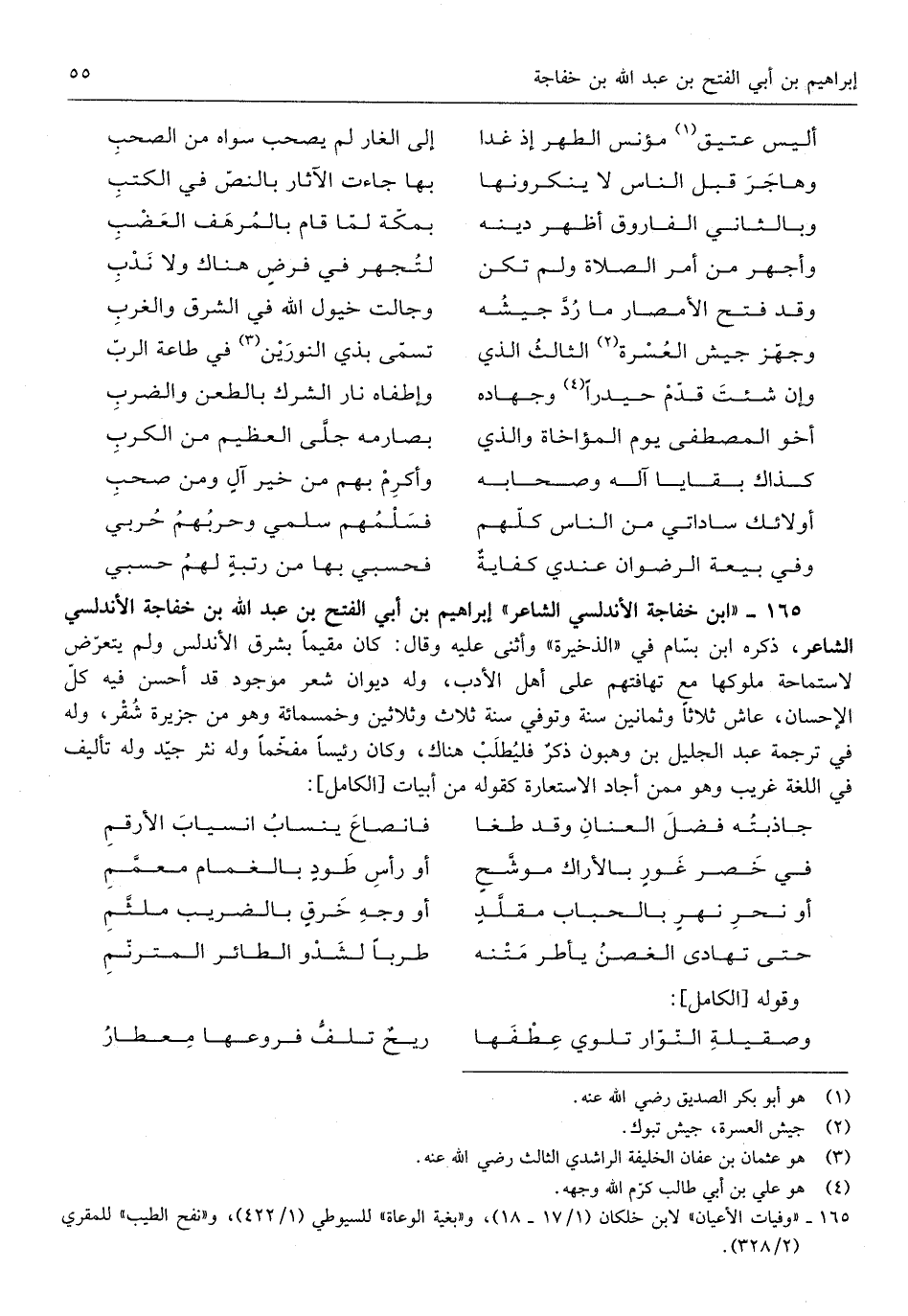 إِبْرَاهِيم بن أبي الْفَتْح بن عبد الله بن خفاجة الأندلسي الشَّاعِر ذكره ابْن بسام فِي الذَّخِيرَة وَأثْنى عَلَيْهِ وَقَالَ كَانَ مُقيما بشرق الأندلس وَلم يتَعَرَّض لاستماحة مُلُوكهَا مَعَ تهافتهم على أهل الْأَدَب وَله ديوَان شعر مَوْجُود قد أحسن فِيهِ كل الْإِحْسَان عَاشَ ثَلَاثًا وَثَمَانِينَ سنة وَتُوفِّي سنة ثَلَاث وَثَلَاثِينَ وَخمْس مائَة وَهُوَ من جَزِيرَة شقر وَله فِي تَرْجَمَة عبد الْجَلِيل بن وهبون ذكر فليطلب هُنَاكَ وَكَانَ رَئِيسا مفخماً وَله نثر جيد وفه تأليف فِي اللُّغَة غَرِيب وَهُوَ مِمَّن أَجَاد الِاسْتِعَارَة كَقَوْلِه من أَبْيَات