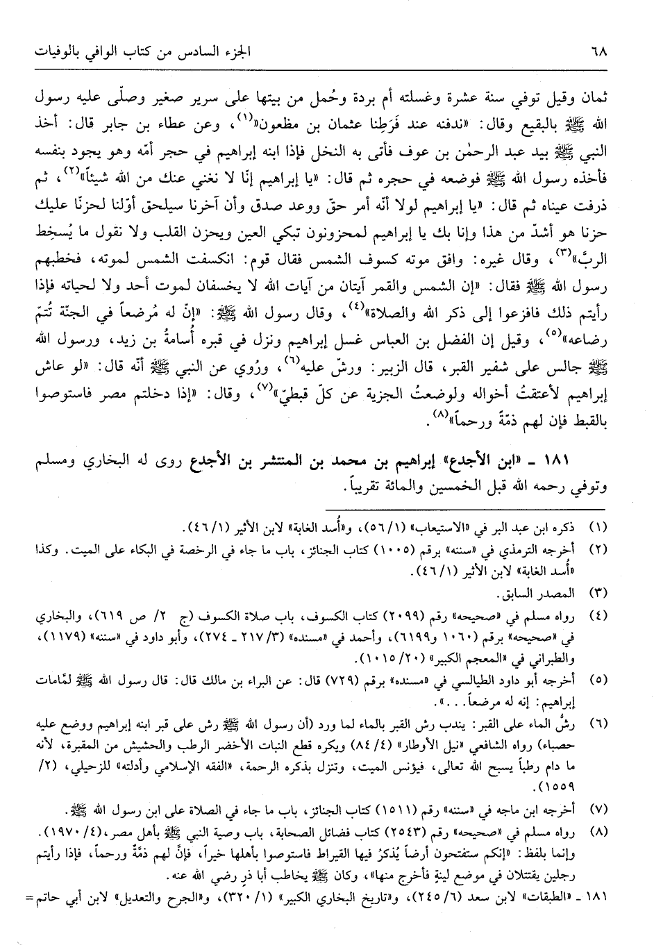 ثَمَان وَقيل توفّي سنة عشر وغسلته أم بردة وَحمل من بَيتهَا على سَرِير صَغِير وَصلى عَلَيْهِ رَسُول الله صلى الله عَلَيْهِ وَسلم بِالبَقِيعِ وَقَالَ ندفنه عِنْد فرطنا عُثْمَان بن مَظْعُون وَعَن عَطاء بن جَابر قَالَ أَخذ النَّبِي صلى الله عَلَيْهِ وَسلم بيد عبد الرَّحْمَن بن عَوْف فَأتى بِهِ النّخل فَإِذا ابْنه إِبْرَاهِيم فِي حجر أمه وَهُوَ يجود بِنَفسِهِ فَأَخذه رَسُول الله صلى الله عَلَيْهِ وَسلم فَوَضعه فِي حجره ثمَّ قَالَ يَا إِبْرَاهِيم إِنَّا لَا نغني عَنْك من الله شَيْئا ثمَّ ذرفت عَيناهُ ثمَّ قَالَ يَا إِبْرَاهِيم لَوْلَا أَنه أَمر حق ووعد صدق وَأَن أخرنا سيلحق أولنا لحزنا عَلَيْك حزنا هُوَ أَشد من هَذَا وَإِنَّا بك يَا إِبْرَاهِيم لَمَحْزُونُونَ تبْكي الْعين ويحزن الْقلب وَلَا نقُول مَا يسْخط الرب وَقَالَ غَيره وَافق مَوته كسوف الشَّمْس فَقَالَ قوم انكسفت الشَّمْس لمَوْته فخطبهم رَسُول الله صلى الله عَلَيْهِ وَسلم فَقَالَ إِن الشَّمْس وَالْقَمَر آيتان من آيَات الله لَا يخسفان لمَوْت أحد وَلَا لِحَيَاتِهِ فَإِذا رَأَيْتُمْ ذَلِك فافزعوا إِلَى ذكر الله وَالصَّلَاة وَقَالَ رَسُول الله صلى الله عَلَيْهِ وَسلم إِن لَهُ مُرْضعًا فِي الْجنَّة تتمّ رضاعه وَقيل إِن الْفضل بن الْعَبَّاس غسل إِبْرَاهِيم وَنزل فِي قَبره أُسَامَة بن زيد وَرَسُول الله صلى الله عَلَيْهِ وَسلم جَالس على شَفير الْقَبْر قَالَ الزبير ورش عَلَيْهِ وروى عَن النَّبِي صلى الله عَلَيْهِ وَسلم أَنه قَالَ لَو عَاشَ إِبْرَاهِيم لأعتقت أَخْوَاله ولوضعت الْجِزْيَة عَن كل قبْطِي وَقَالَ إِذا دَخَلْتُم مصر فَاسْتَوْصُوا بالقبط فَإِن لَهُم ذمَّة ورحماً