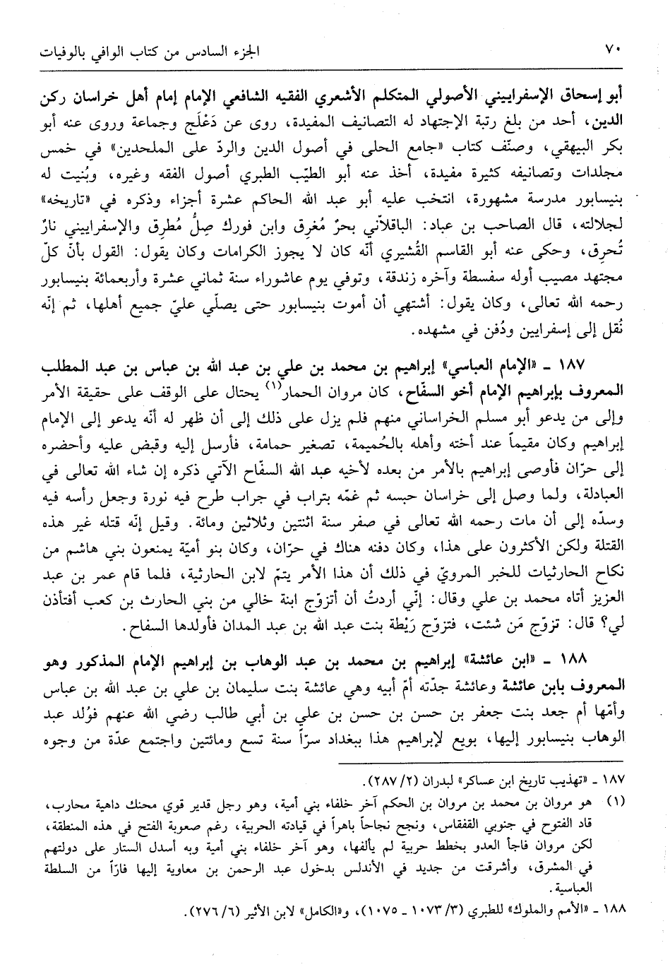 إِبْرَاهِيم بن مُحَمَّد بن عَليّ بن عبد الله بن عَبَّاس بن عبد الْمطلب الْمَعْرُوف بإبراهيم الإِمَام أَخُو السفاح كَانَ مَرْوَان الْحمار يحتال على الْوَقْف على حَقِيقَة لأمر وَإِلَى من يَدْعُو أَبُو مُسلم الْخُرَاسَانِي مِنْهُم فَلم يزل على ذَلِك إِلَى أَن ظهر لَهُ أَنه يَدْعُو إِلَى الإِمَام إِبْرَاهِيم وَكَانَ مُقيما عِنْد أُخْته وَأَهله بالحميمة تَصْغِير حمامة فَأرْسل إِلَيْهِ وَقبض عَلَيْهِ وأحضره إِلَى حران فأوصى إِبْرَاهِيم بِالْأَمر من بعده لِأَخِيهِ عبد الله السفاح الْآتِي ذكره إِن شَاءَ الله تَعَالَى فِي الْعِبَادَة وَلما وصل إِلَى خُرَاسَان حَبسه ثمَّ غمه بِتُرَاب فِي جراب طرح فِيهِ نورة وَجعل رَأسه فِيهِ وسده إِلَى أَن مَاتَ رَحمَه الله تَعَالَى فِي صفر سنة اثْنَتَيْنِ وَثَلَاثِينَ وَمِائَة وَقيل إِنَّه قَتله غير هَذِه القتلة وَلَكِن الْأَكْثَرُونَ على هَذَا وَكَانَ دَفنه هُنَاكَ فِي حران وَكَانَ بَنو أُميَّة يمْنَعُونَ بني هَاشم من نِكَاح الحارثيات للْخَبَر الْمَرْوِيّ فِي ذَلِك أَن هَذَا الْأَمر يتم لِابْنِ الحارثية فَلَمَّا قَامَ عمر بن عبد الْعَزِيز أَتَاهُ مُحَمَّد بن عَليّ وَقَالَ إِنِّي أردْت أَن أَتزوّج ابْنة خَالِي من بني الْحَارِث بن عبد أفتأذن لي قَالَ تزوج من شِئْت فَتزَوج ريطة بنت عبد الله بن عبد المدان فأولدها السفاح