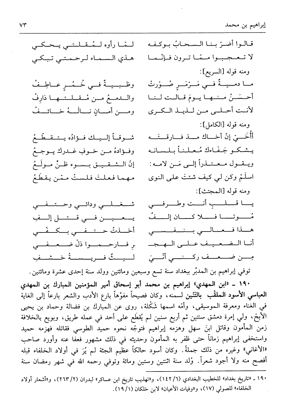 إِبْرَاهِيم بن مُحَمَّد أَبُو إِسْحَاق أَمِير الْمُؤمنِينَ الْمُبَارك ابْن الْمهْدي العباسي الْأسود الملقب بالتنين لسمنه وَكَانَ فصيحاً مفوهاً بارع الْأَدَب وَالشعر بارعاً إِلَى الْغَايَة فِي الْغناء وَمَعْرِفَة الموسيقى وَأمه اسْمهَا شكْلَة روى عَن الْمُبَارك بن فضَالة وَحَمَّاد بن يحيى الْأَبَح ولي إمرة دمشق سنتَيْن ثمَّ أَربع سِنِين لم يقطع على أحد فِي عمله طَرِيق وبويع بالخلافة زمن الْمَأْمُون وَقَاتل ابْن سهل وهزمه إِبْرَاهِيم فَتوجه نَحوه حميد الطوسي فقاتله فَهَزَمَهُ حميد واستخفى إِبْرَاهِيم زَمَانا حَتَّى ظفر بِهِ الْمَأْمُون وَحَدِيثه فِي ذَلِك مَشْهُور فَعَفَا عَنهُ وَأورد صَاحب الأغاني وَغَيره من ذَلِك جملَة وَكَانَ أسود حالكاً عَظِيم الجثة لم ير فِي أَوْلَاد الْخُلَفَاء قبله أفْصح مِنْهُ وَلَا)