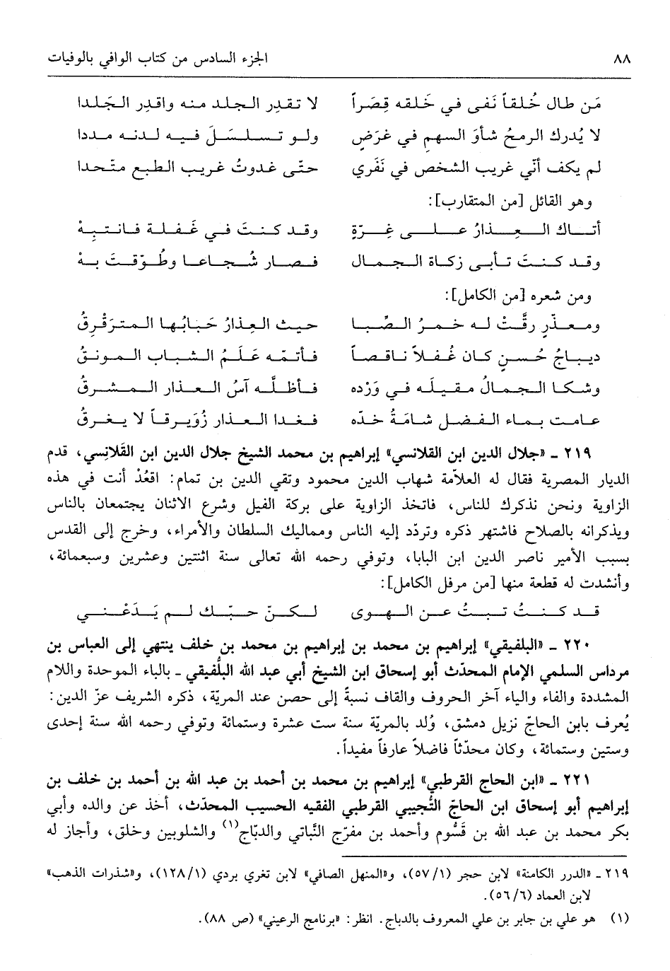 إِبْرَاهِيم بن مُحَمَّد الشَّيْخ جلال الدّين ابْن القلانسي قدم الديار المصرية فَقَالَ لَهُ الْعَلامَة شهَاب الدّين مَحْمُود وتقي الدّين ابْن تَمام اقعد أَنْت فِي هَذِه الزاوية وَنحن نذكرك للنا فَاتخذ الزاوية على بركَة الْفِيل وَشرع الِاثْنَان يَجْتَمِعَانِ بِالنَّاسِ ويذكرانه بالصلاح فاشتهر ذكره وَتردد إِلَيْهِ النَّاس ومماليك السُّلْطَان والأمراء وَخرج إِلَى الْقُدس بِسَبَب الْأَمِير نَاصِر الدّين ابْن البابا وَتُوفِّي رَحمَه الله تَعَالَى سنة اثْنَتَيْنِ وَعشْرين وَسبع مائَة وأنشدت لَهُ قِطْعَة مِنْهَا