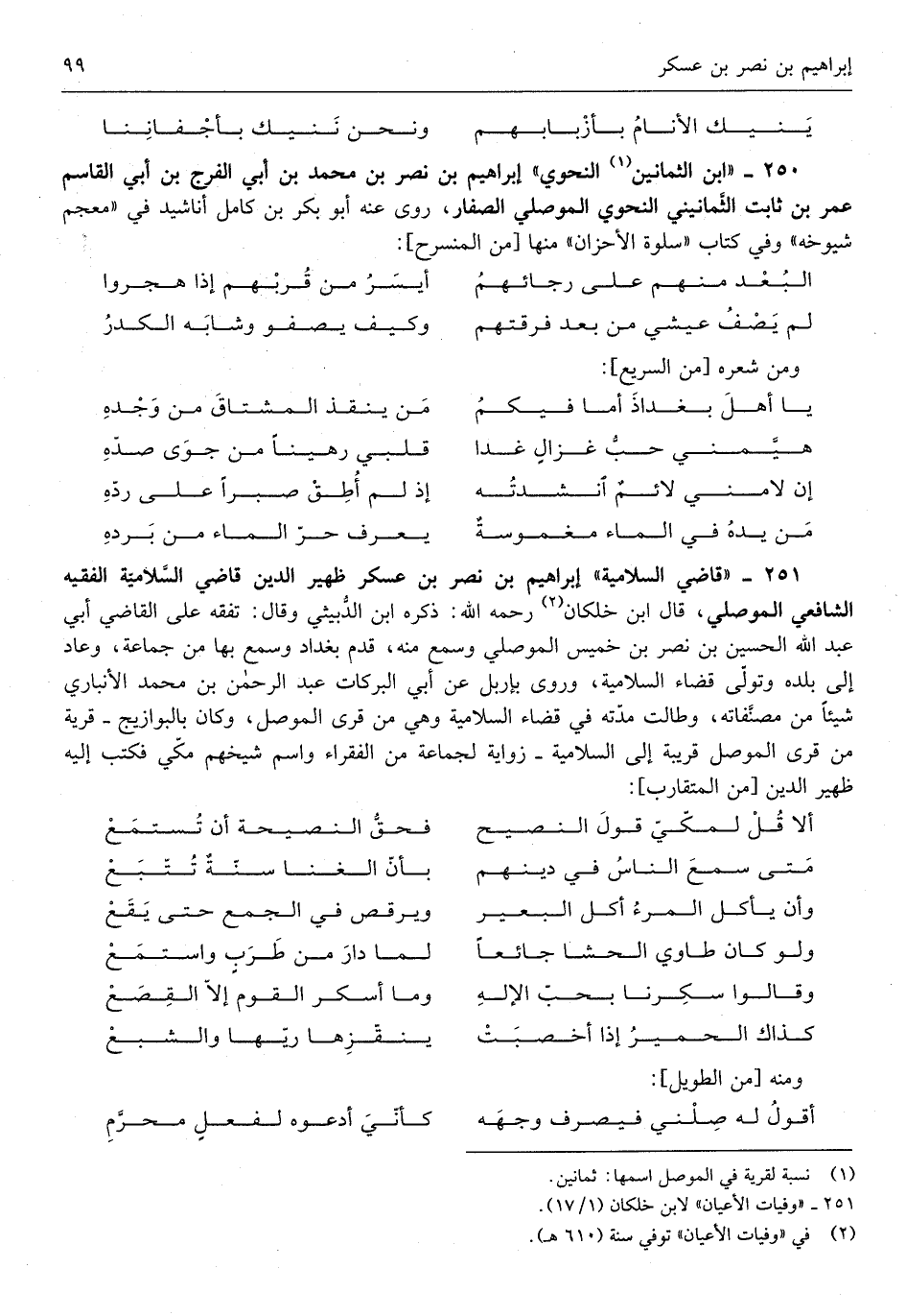 إِبْرَاهِيم بن نصر بن عَسْكَر ظهير الدّين قَاضِي السلامية الْفَقِيه الشَّافِعِي الْموصِلِي قَالَ ابْن خلكان رَحمَه الله ذكره ابْن الدبيثي وَقَالَ تفقه على القَاضِي أبي عبد الله الْحُسَيْن بن نصر بن خَمِيس الْموصِلِي وَسمع مِنْهُ قدم بغداذ وَسمع بهَا من جمَاعَة وَعَاد إِلَى بَلَده وَتَوَلَّى قَضَاء السلامية وَرُوِيَ بإربل عَن أبي البركات عبد الرَّحْمَن بن مُحَمَّد الْأَنْبَارِي شَيْئا من مصنفاته وطالت مدَّته فِي قَضَاء السلامية وَهِي من قرى الْموصل وَكَانَ بالبوازيج قَرْيَة من قرى)