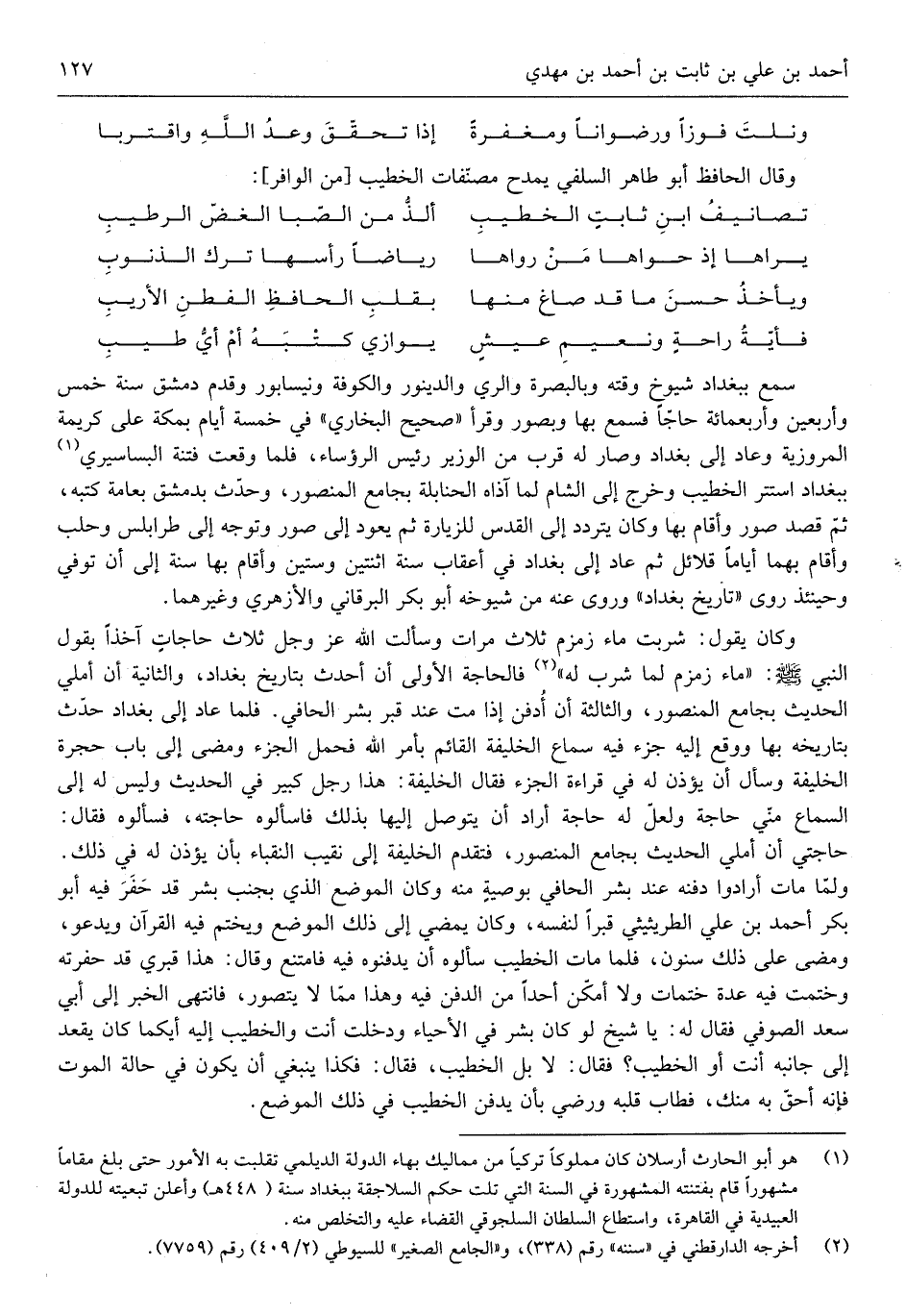 وَكَانَ يَقُول شربت مَاء زَمْزَم ثَلَاث مَرَّات وَسَأَلت الله عز وَجل ثَلَاث حاجاتٍ آخِذا بقول النَّبِي صلى الله عَلَيْهِ وَسلم مَاء زَمْزَم لما شرب لَهُ فالحاجة الأولى أَن أحدث بتاريخ بغداذ وَالثَّانيَِة أَن أملي الحَدِيث بِجَامِع الْمَنْصُور وَالثَّالِثَة أَن أدفن إِذا مت عِنْد قبر بشر الحافي فَلَمَّا عَاد إِلَى بغداذ حدث بتاريخه بهَا وَوَقع إِلَيْهِ جُزْء فِيهِ سَماع الْخَلِيفَة الْقَائِم بِأَمْر الله فَحمل الْجُزْء وَمضى إِلَى بَاب حجرَة الْخَلِيفَة وَسَأَلَ أَن يُؤذن لَهُ فِي قِرَاءَة الْجُزْء فَقَالَ الْخَلِيفَة هَذَا رجل كَبِير فِي الحَدِيث وَلَيْسَ لَهُ إِلَى السماع مني حَاجَة وَلَعَلَّ لَهُ حَاجَة أَرَادَ أَن يتَوَصَّل إِلَيْهَا بذلك فَاسْأَلُوهُ حَاجته فَسَأَلُوهُ فَقَالَ حَاجَتي أَن أملي الحَدِيث بِجَامِع الْمَنْصُور فَتقدم الْخَلِيفَة إِلَى نقيب النُّقَبَاء بِأَن يُؤذن لَهُ فِي ذَلِك وَلما مَاتَ أَرَادوا دَفنه عِنْد بشر الحافي بوصيةٍ مِنْهُ وَكَانَ الْموضع الَّذِي بِجنب بشر قد حفر فِيهِ أَبُو بكر أَحْمد بن عَليّ الطريثيثي قبراً لنَفسِهِ وَكَانَ يمْضِي إِلَى ذَلِك الْموضع وَيخْتم فِيهِ الْقُرْآن وَيَدْعُو وَمضى على ذَلِك سنُون فَلَمَّا مَاتَ الْخَطِيب سَأَلُوهُ أَن يدفنوه فِيهِ فَامْتنعَ وَقَالَ هَذَا قَبْرِي قد حفرته وختمت فِيهِ عدَّة ختمات وَلَا أمكن أحدا من الدّفن)